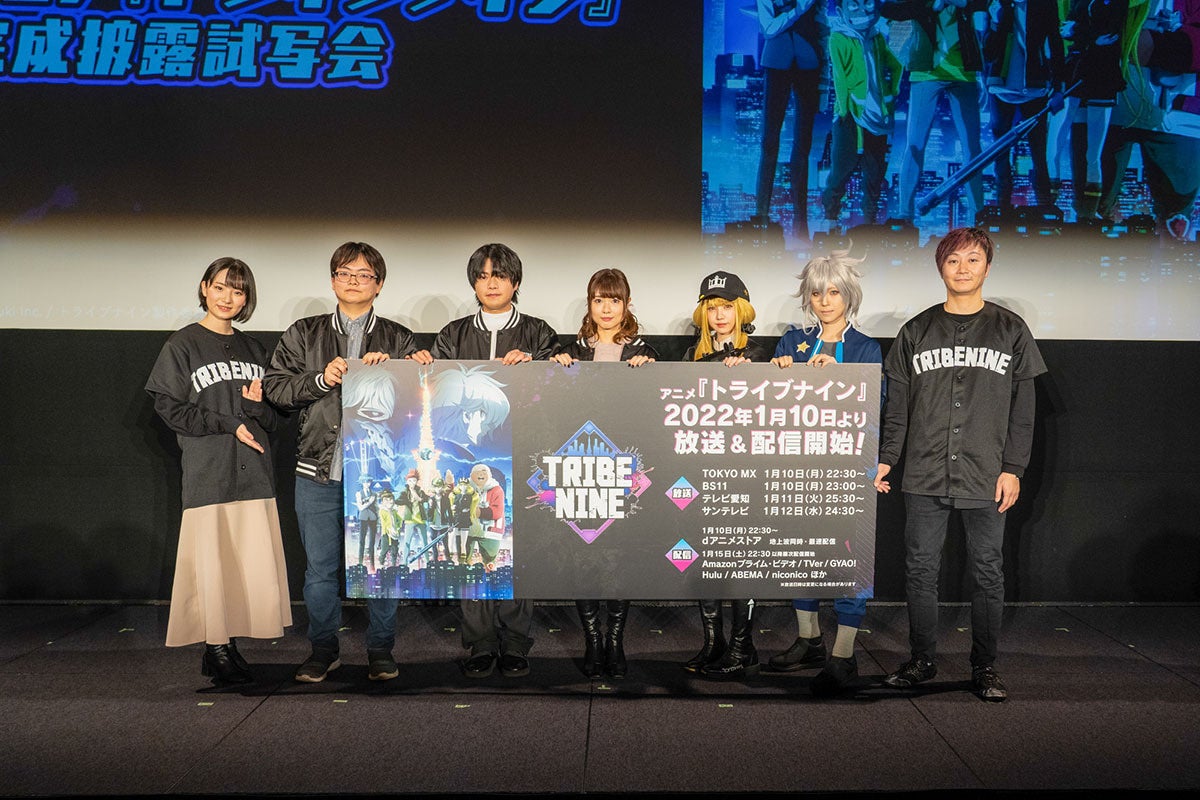 2021年12月22日(水)、アニメ『トライブナイン』完成披露試写会をメディア・関係者向けに開催いたしました。原案の小高和剛氏、アニメ監督の青木悠氏、声優の堀江瞬氏(ミナトトライブ・白金ハル役)、渕上舞氏(ミナトトライブ・有栖川さおり役)、さらに応援大使としてコスプレイヤーのえなこ氏、つんこ氏がそれぞれ有栖川さおり、神谷瞬の衣装に身を包んで登場いたしました。