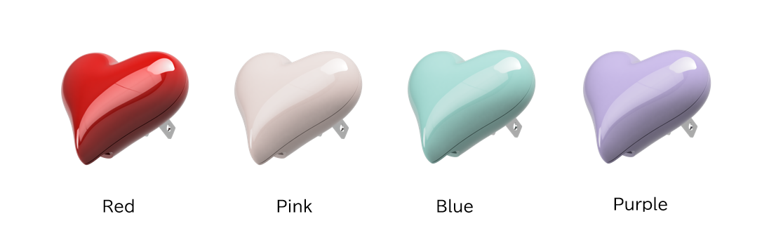 「HeartBuds(Charger)」は、ハート型の充電器です。USB(Type-C)コネクタが使用でき、出力は最大1.5A(7.5W)。スマートフォンや周辺機器の充電はもちろん、お部屋、職場のデスクのインテリアのアクセントとしてもお楽しみいただけます。ハート型ワイヤレスイヤホンの「HeartBuds」と同様、4色のカラーバリエーションを予定しており、Redは2月9日以降、Pinkは3月中旬以降、BlueとPurpleは4月中旬以降に順次販売予定です。