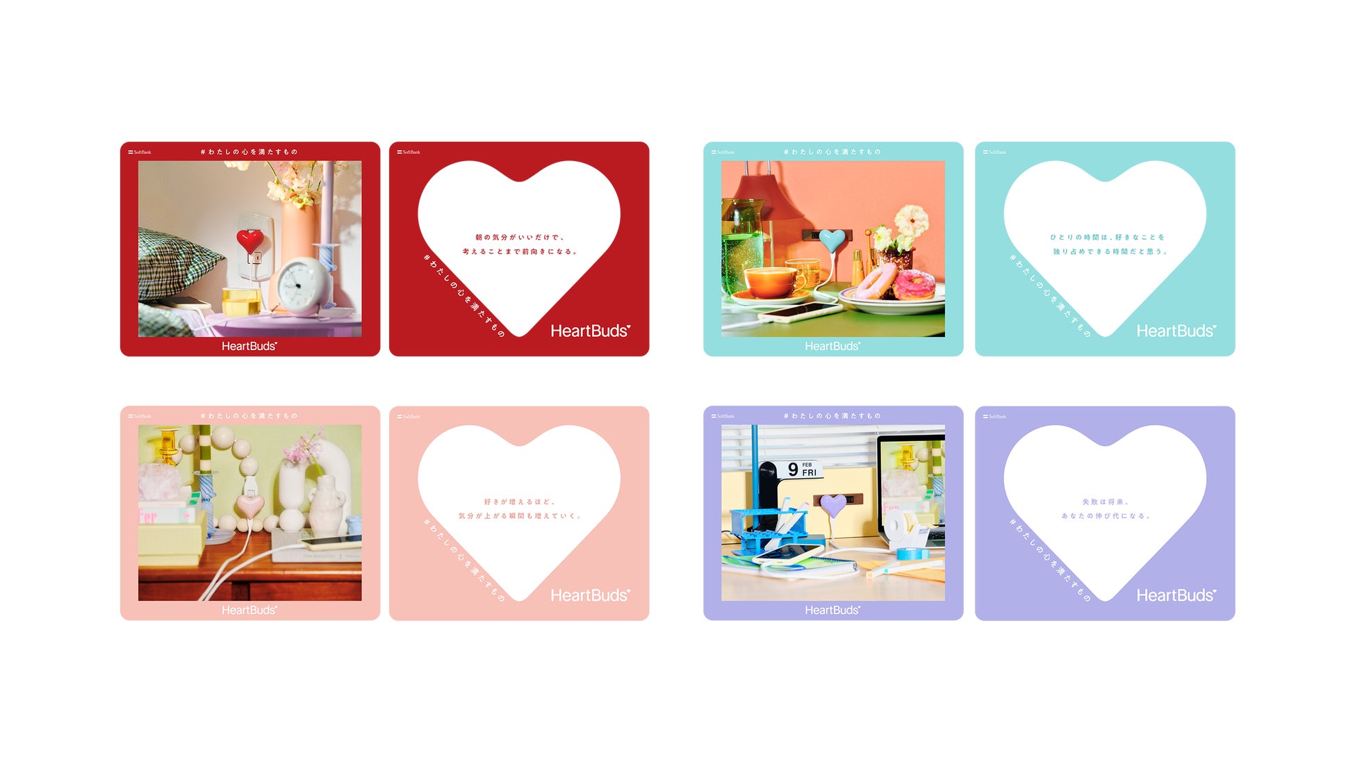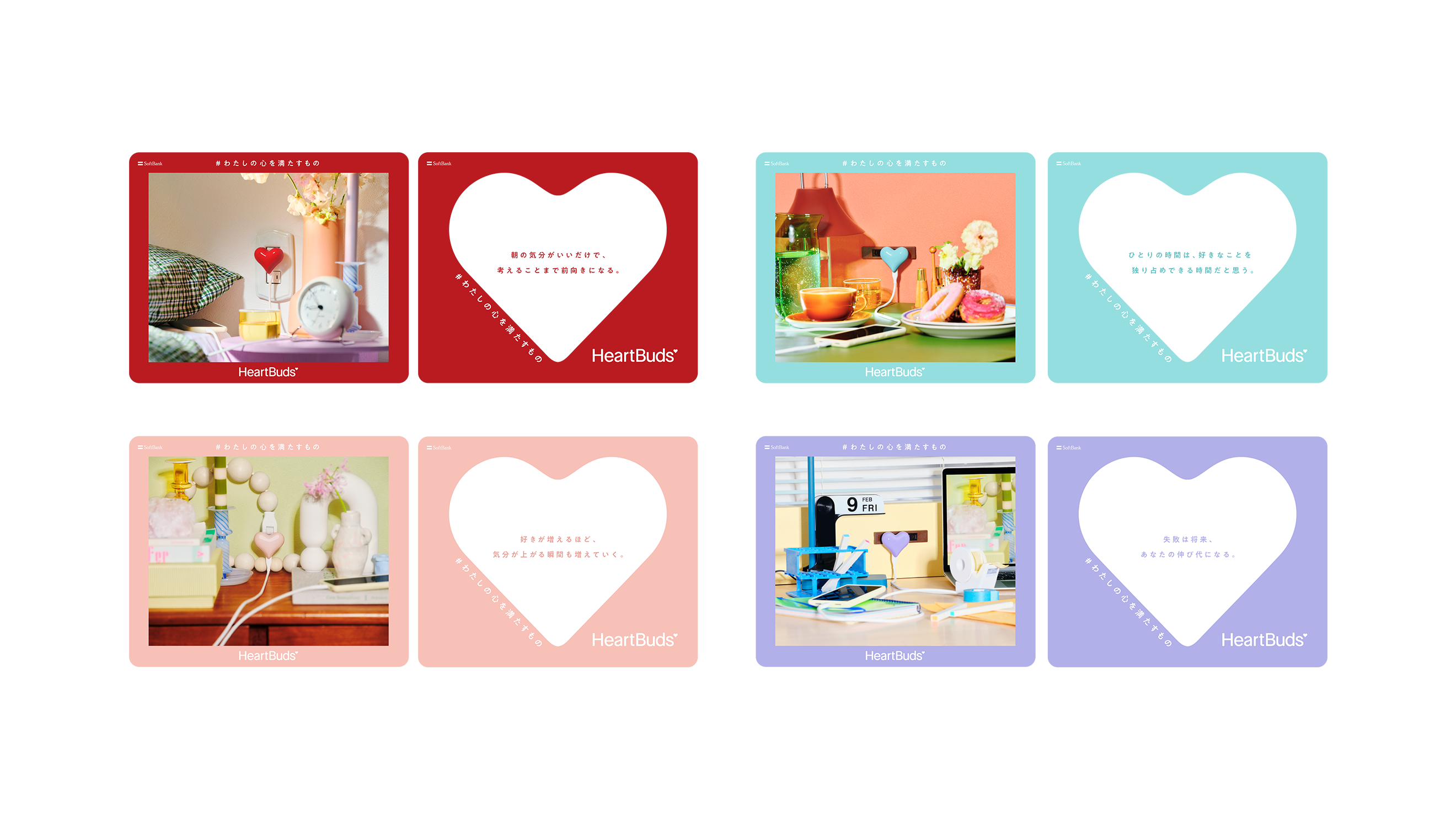 「HeartBuds(Charger)」は自宅、カフェ、職場などさまざまな生活シーンでご使用いただけます。充電器としての機能だけではなく、可愛いデザインがインテリアのようにあなたの心を満たしてくれます。そんな商品の魅力を伝えるため、渋谷エリアに全長22mのOOH広告を掲出。各色のキービジュアルの横にはハート型の鏡があり、鏡に映るあなたの日常に合う商品であることを伝えているとともに、鏡越しに可愛い写真が撮れるようなデザインにもなっています。
