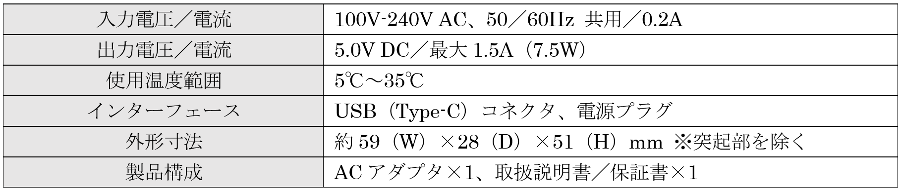 ・USB(Type-C)コネクタが使用でき、出力は最大1.5A(7.5W)