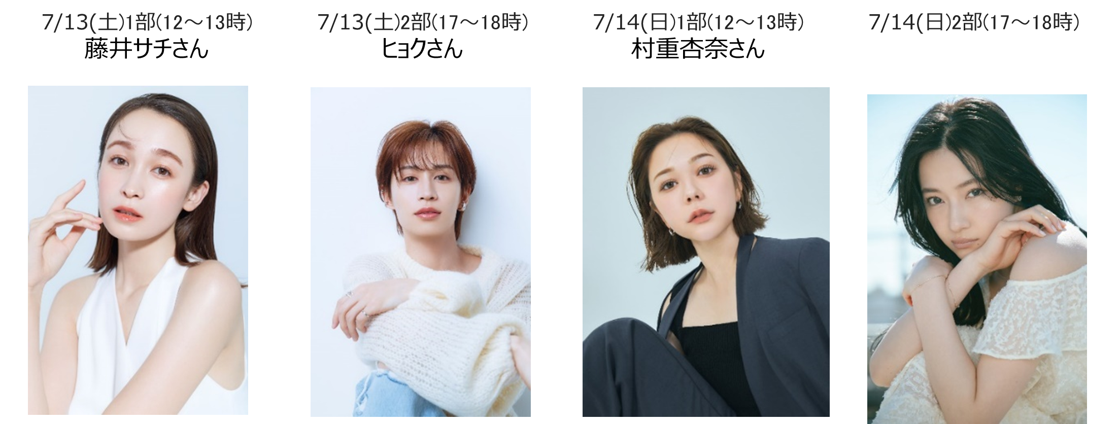 7/14 | 日 | 第1部 | 12~13時 | 村重杏奈さん、 MC深海さん | ISOI |