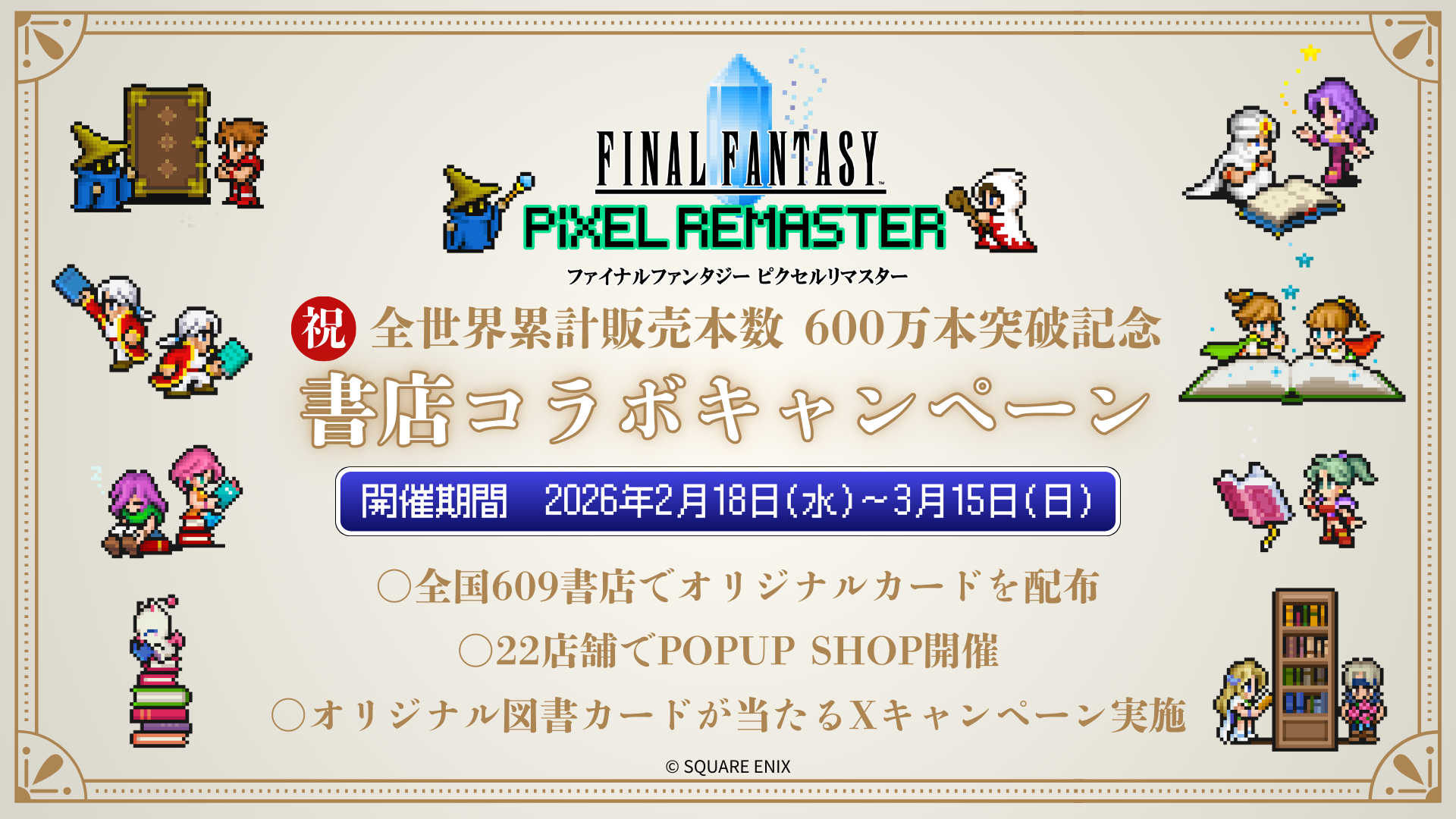株式会社スクウェア・エニックスは2025年12月18日(木)に、RPG「ファイナルファンタジー」の2Dリマスター作品群「ファイナルファンタジー ピクセルリマスター」シリーズの全世界累計販売本数が600万本を突破したことを発表しました。日販はこれを記念し、全国609書店にて書店コラボキャンペーンを開催します。