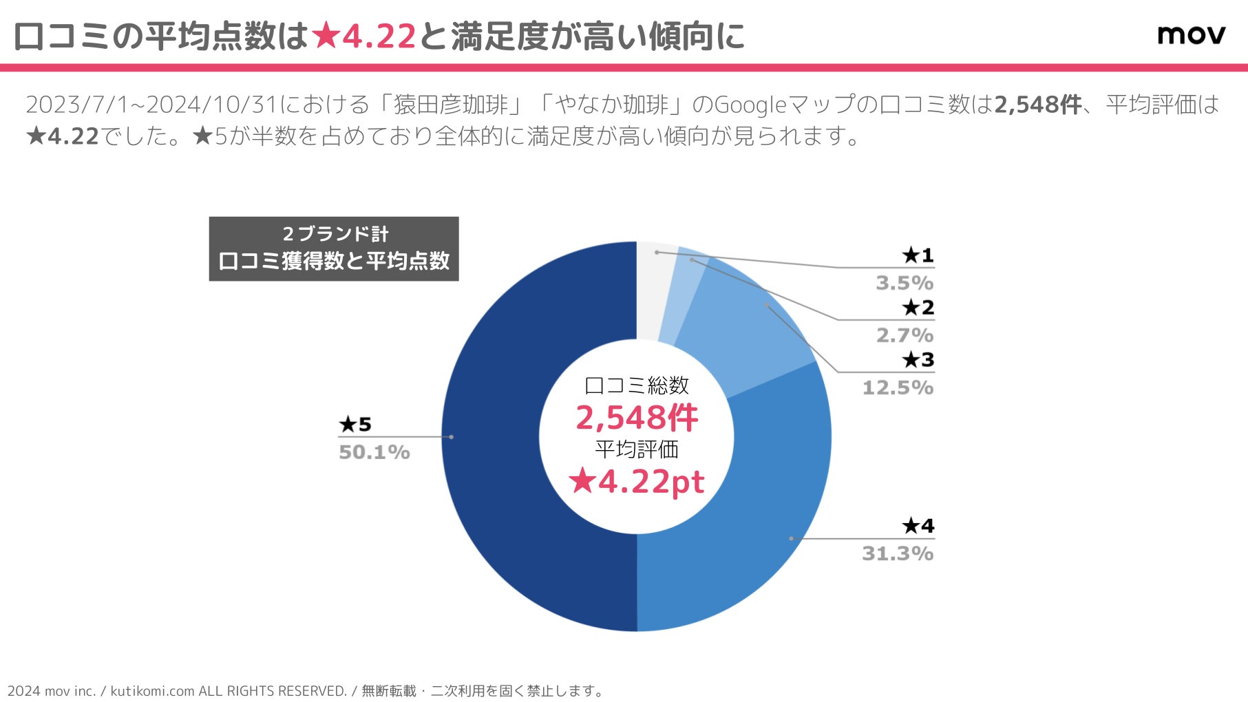 2023/7/1〜2024/10/31における「猿田彦珈琲」「やなか珈琲」のGoogleマップの口コミ数は2,548件、平均評価は★4.22でした。★5が半数を占めており全体的に満足度が高い傾向が見られます。