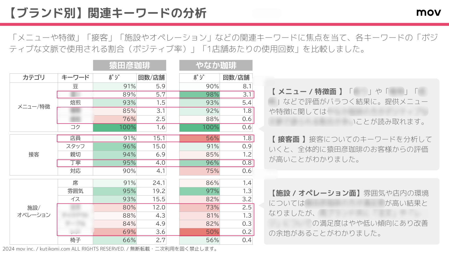 評価のバラつきやポジティブな文脈で語られる割合の多さなどが見えてきたとともに、全体傾向として両ブランド共に同じキーワードでお客様からの満足度が低い傾向にあることがわかりました。