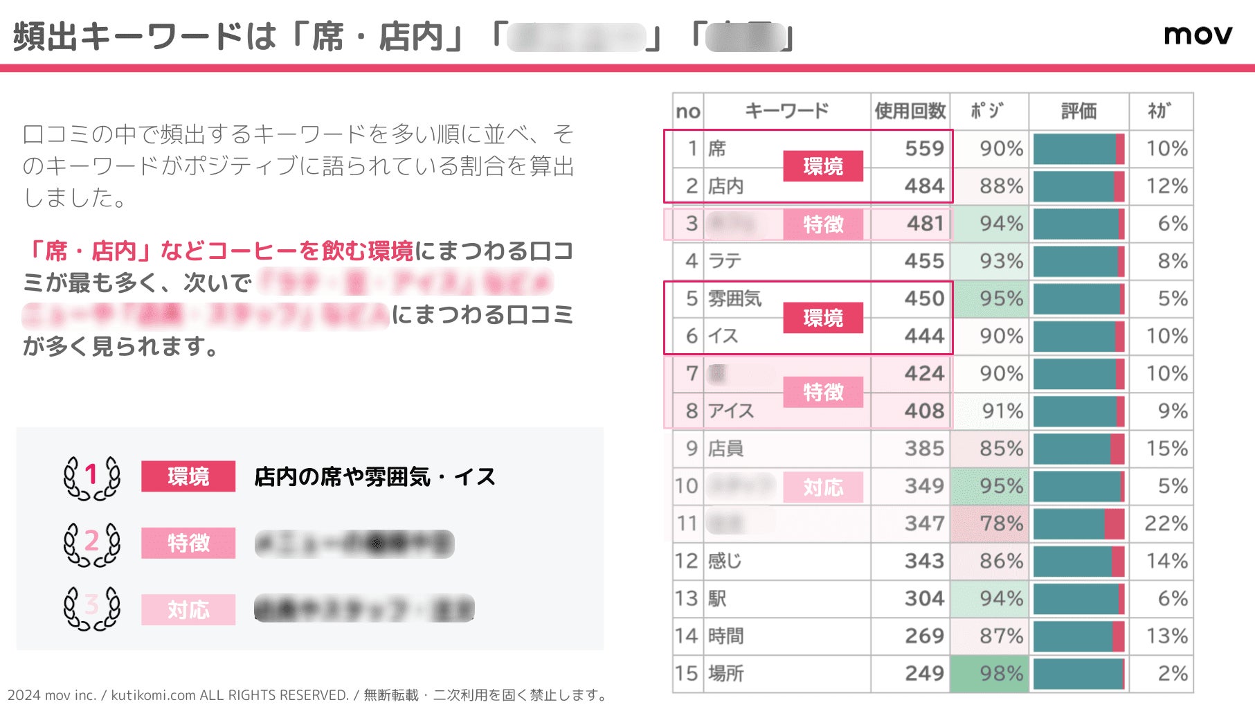 口コミの中で頻出するキーワードを多い順に並べ、そのキーワードがポジティブに語られている割合を算出しました。