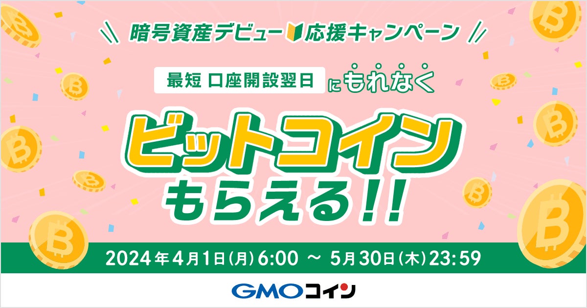 GMOコインは2024年4月1日(月)より「暗号資産デビュー応援キャンペーン」を開催することをお知らせいたします。3月にビットコイン(BTC)の価格は1,000万円を突破し、史上最高値を更新しました。このような相場状況の中、暗号資産のお取引を始めてみたいというお客さまを応援させていただくべく、キャンペーン期間中に新規に口座開設をしていただいたお客さま全員を対象に、最短口座開設翌日にビットコイン(BTC)をプレゼントいたします。