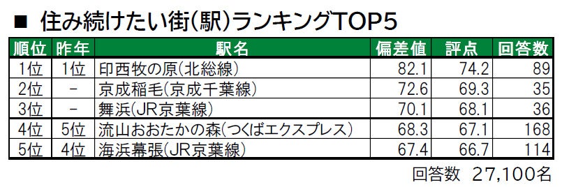 1位は2年連続で印西牧の原で、「住みここち(駅)」でも1位となっています。2位は京成稲毛、3位は舞浜で、いずれも昨年は累計回答数が30名未満だったためランキング集計対象外だった駅です。