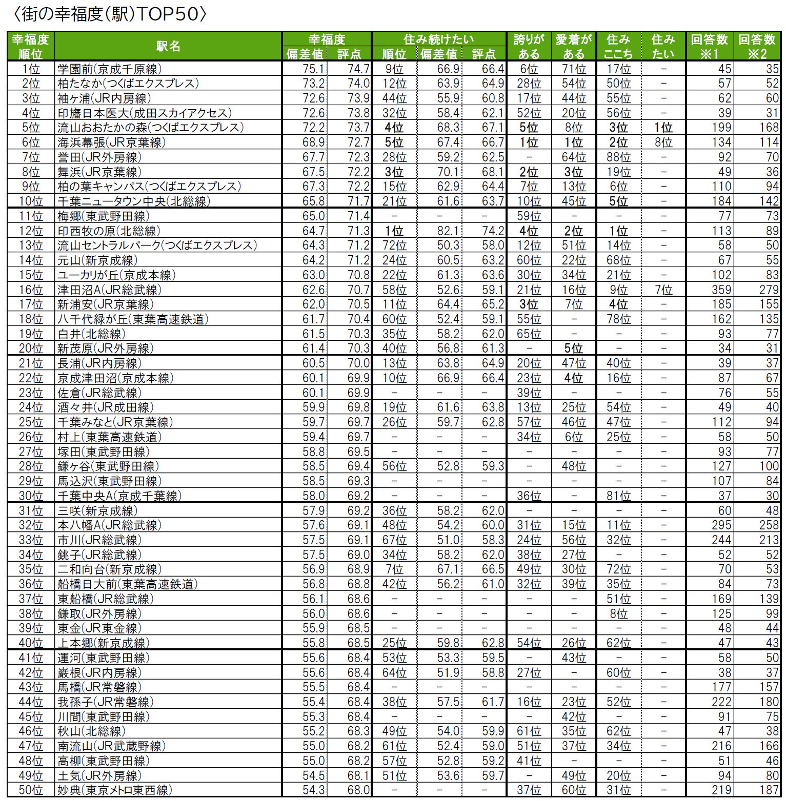 •「街の幸福度ランキング」は、2019年~2022年の回答を、「住み続けたい街ランキング」は、2020年~2022年の回答を累積して集計しています。•「街の幸福度(駅)ランキング・住み続けたい街(駅)ランキング」は、駅徒歩15分以内に居住している回答者が30名以上の駅を、「街の幸福度(自治体)ランキング・住み続けたい街(自治体)ランキング」は、回答者50名以上の自治体を対象として集計しています。