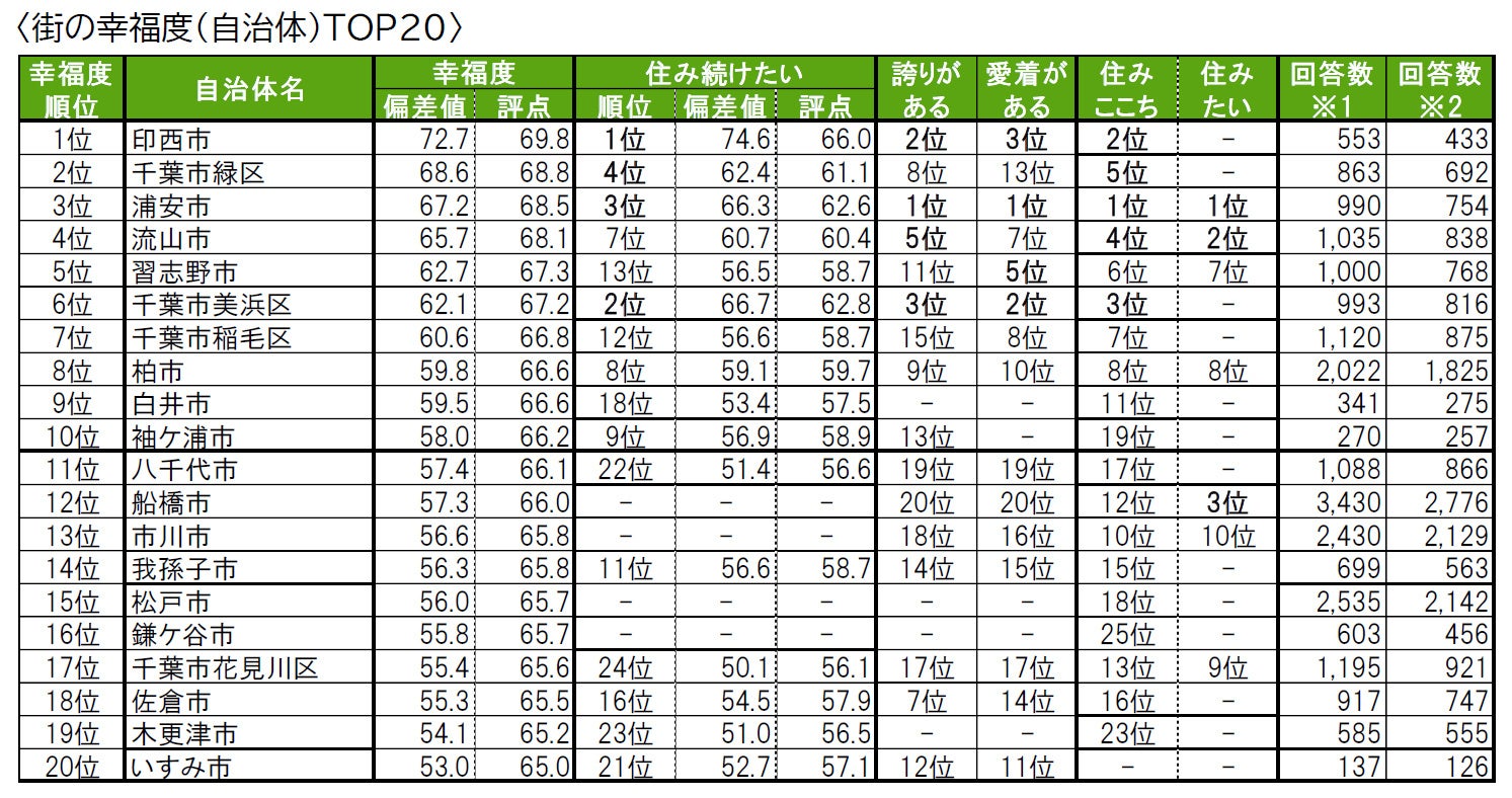 - 街の幸福度(自治体)ランキング<TOP20>&住み続けたい街/街に誇りがある/街に愛着がある<各TOP20>