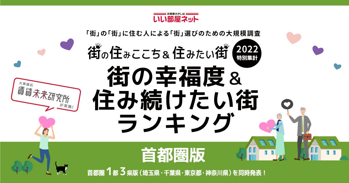 大東建託株式会社(本社:東京都港区、代表取締役社長:小林克満)は、過去最大級の居住満足度調査を行い、「いい部屋ネット 街の幸福度ランキング2022<千葉県版>」「いい部屋ネット 住み続けたい街ランキング2022