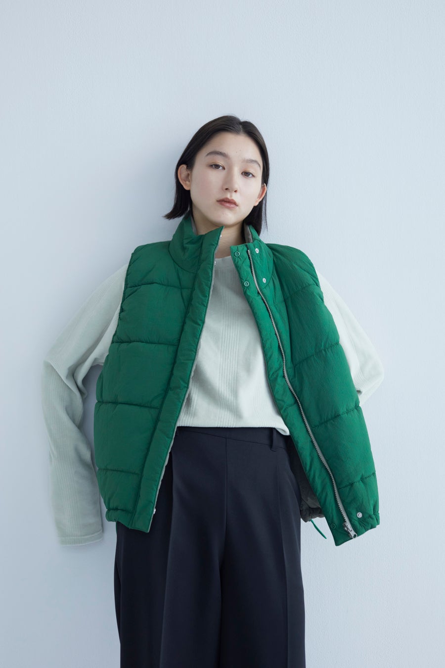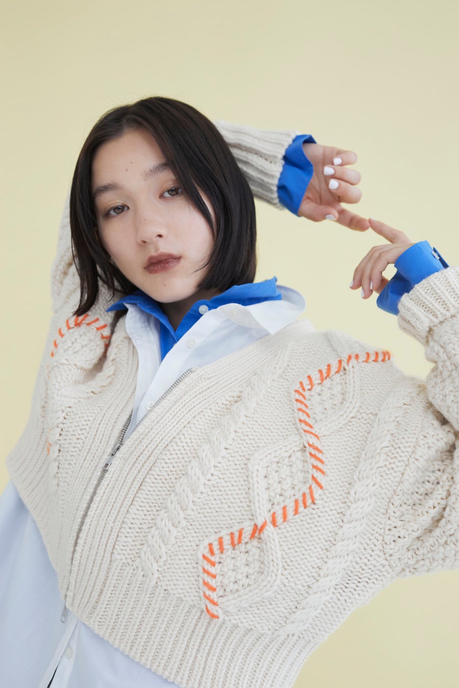 昨年も好評だった配色ハンドステッチニットは、今年らしいクロップド丈にアップデート。ダブルジップを採用し、羽織としてはもちろん、上下のジップを調整してお好みの抜け感で着回しを楽しんでいただけます。
