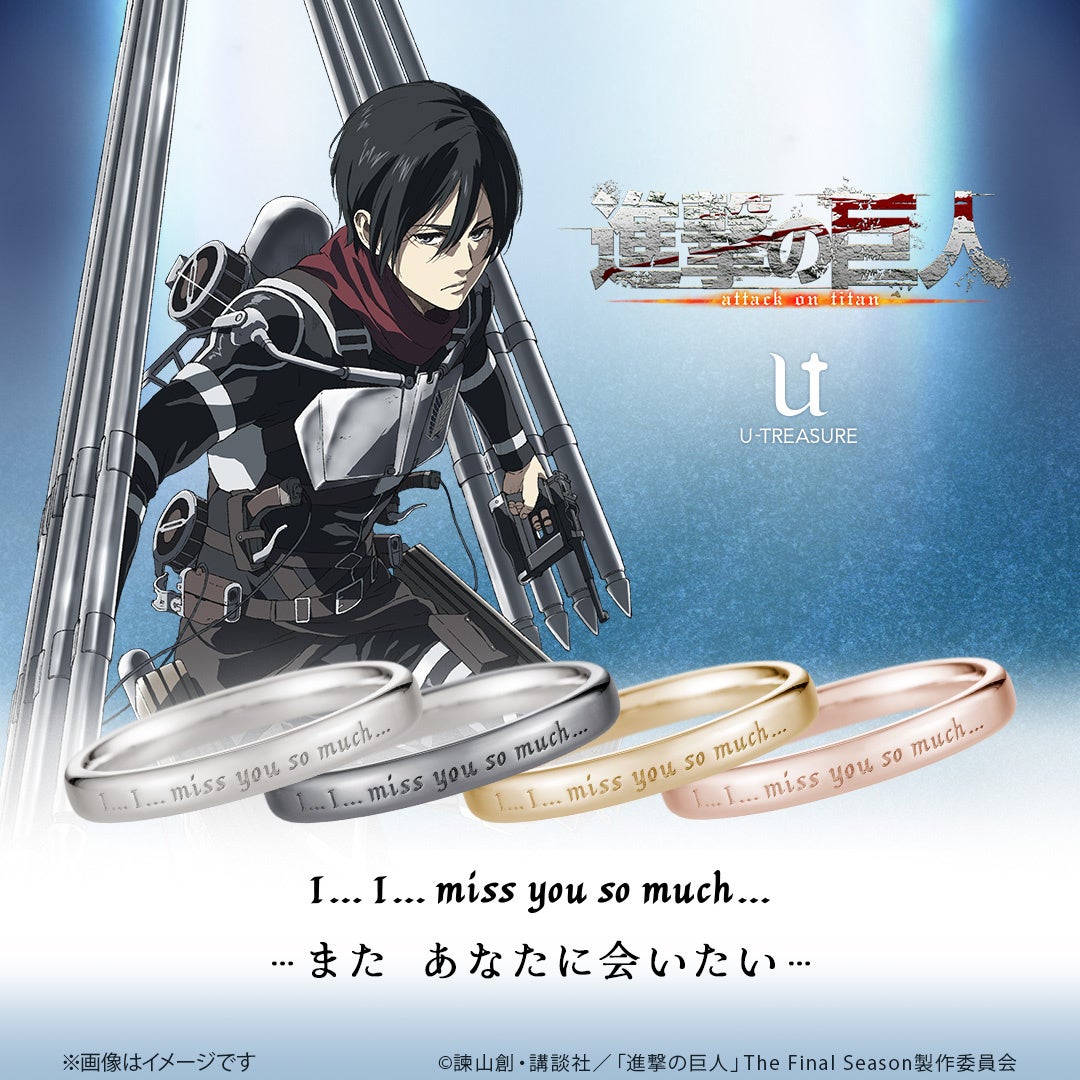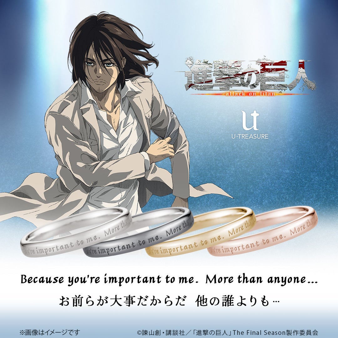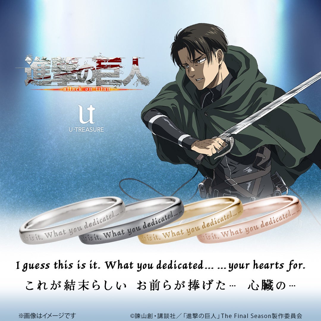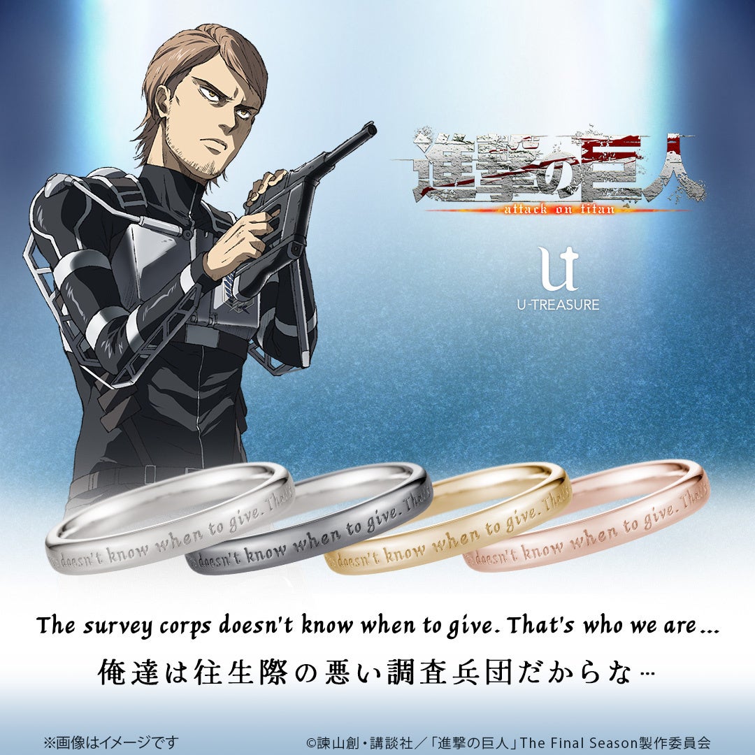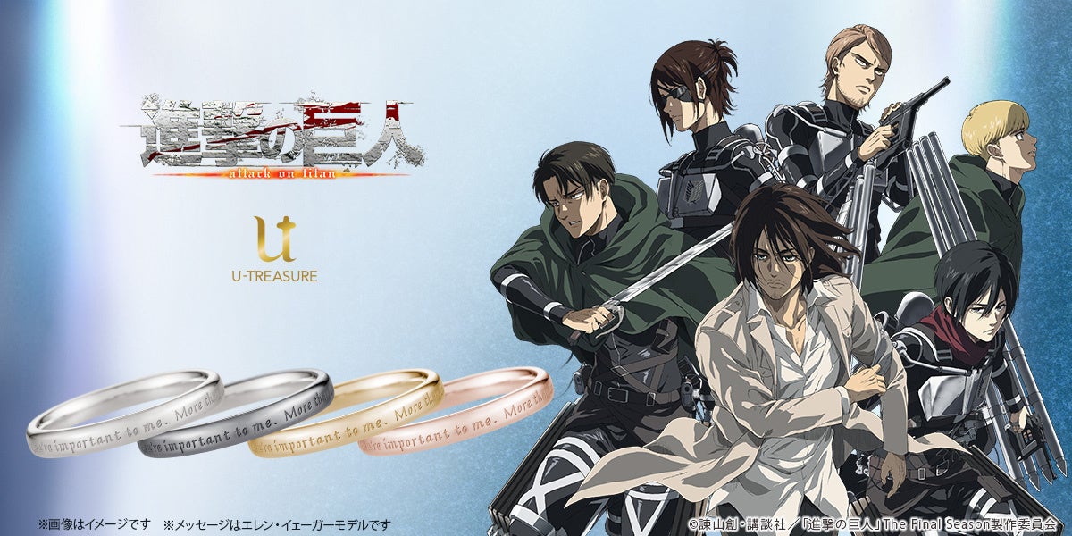 株式会社ユートレジャー(本社:東京都新宿区、代表取締役:伊藤 崇史)は、TVアニメ『進撃の巨人』とのコラボレーションアイテム「シンプルメッセージリング(指輪)」を2024年9月19日(木)~10月28日(月)の期間、ユートレジャーオンラインショップ、ユートレジャーコンセプトストア池袋にて予約受け付けを行います。