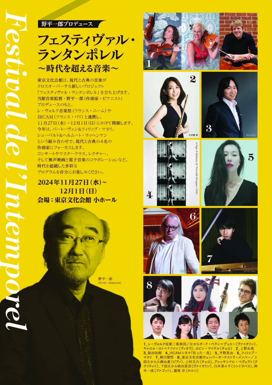 東京文化会館は、当館音楽監督・野平一郎(作曲家・ピアニスト)プロデュースのもと、レ・ヴォルク音楽祭(フランス・ニーム)やIRCAM(フランス・パリ)と連携し、11月27日(水)~12月1日(日)にかけて「フェスティヴァル・ランタンポレル Festival de l’Intemporel~時代を超える音楽~」を開催します。