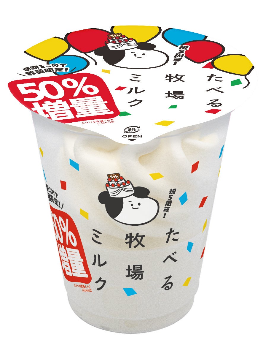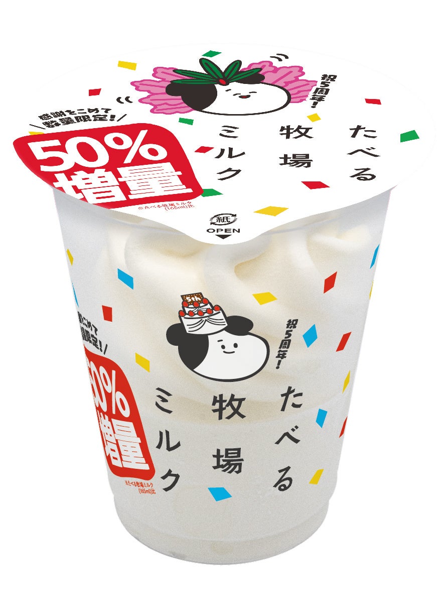 このたびは、誕生5周年を記念して、容量を50%増量した「たべる牧場ミルク50%増量」を数量限定で発売いたします。通常容量の「たべる牧場ミルク」と同価格の値段に据え置くことで、大変おトクにお楽しみいただける仕様にいたしました。