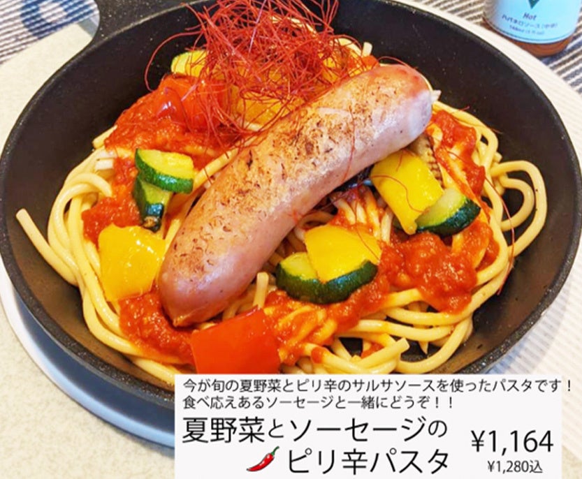7月に発売された新メニュー【夏野菜とソーセージのピリ辛パスタ】。