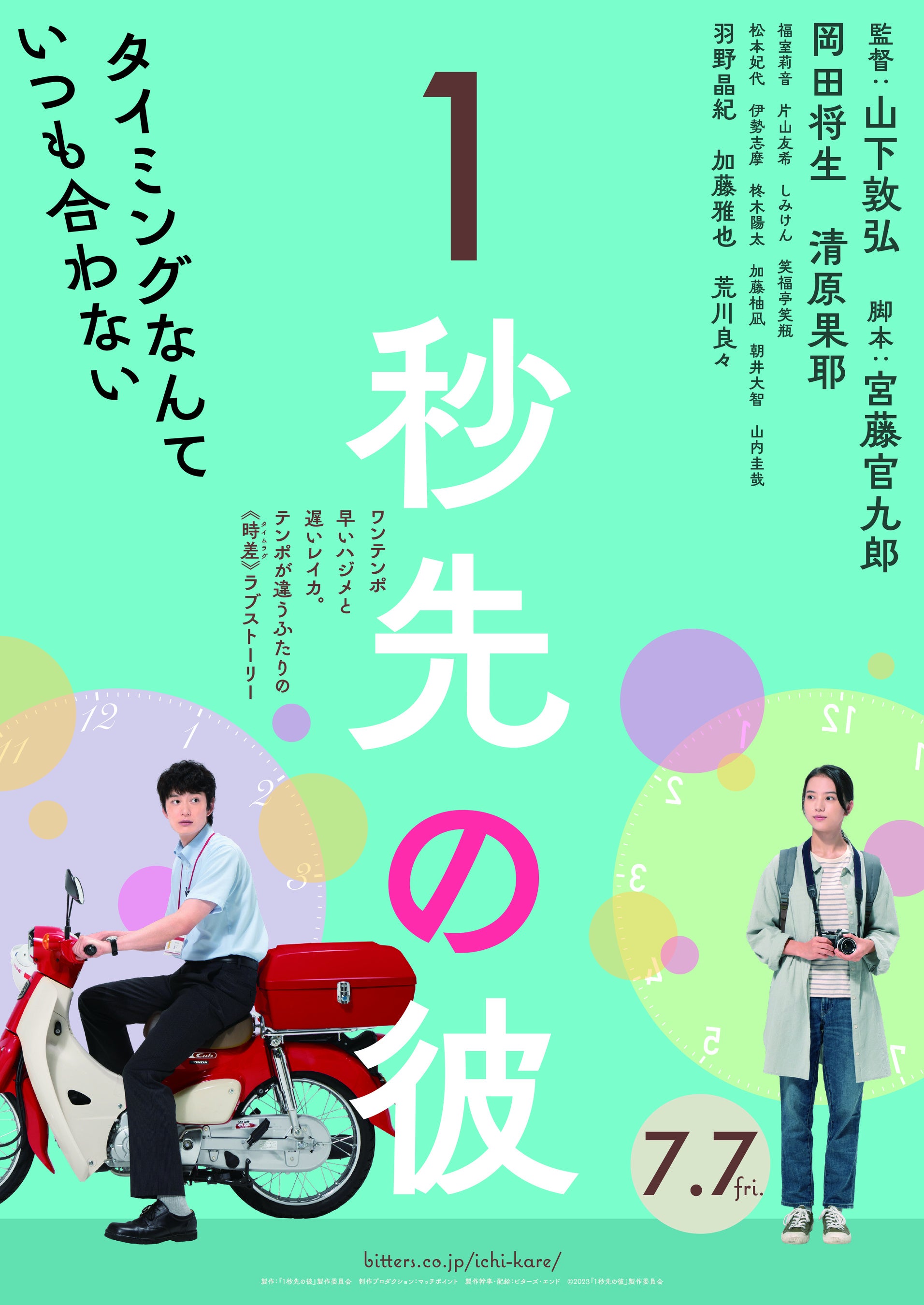 『1秒先の彼』は京都を舞台に、何をするにも人より1秒早いハジメ(岡田将生)と1秒遅いレイカ(清原果耶)の“消えた1日”を巡る物語。郵便局の窓口で働くハジメは、何をするにもとにかく 1 秒早い。記念写真では必ず目をつむり、漫才を見て笑うタイミングも人より早い。街中で路上ミュージシャン・桜子の歌声に惹かれて恋に落ちたハジメは花火大会デートの約束をするも、目覚めるとなぜか翌日に。“花火大会デート”が消えてしまった…!? 秘密を握るのは、毎日郵便局にやってくる、何でも 1 秒遅い大学 7 回生のレイカのようで...。 脇を固めるのは、荒川良々、羽野晶紀、加藤雅也、福室莉音、片山友希、しみけん、松本妃代、伊勢志摩、柊木陽太、加藤柚凪、朝井大智、山内圭哉ら個性豊かな俳優陣。また、先日惜しくも他界された笑福亭笑瓶が、飾らない人柄そのままに本人役でハジメが聴いているラジオ番組のDJと写真店店主の一人二役として出演している。