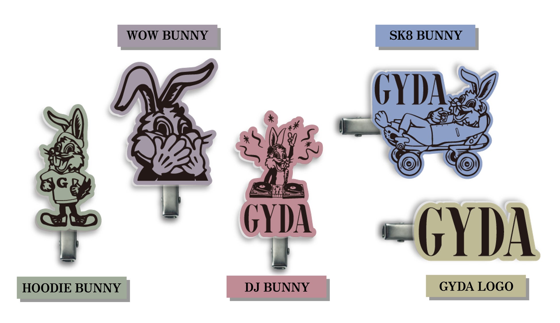 ファッションブランド「GYDA」のキャラクター「GYDA BUNNY」やブランドロゴをあしらったヘアクリップ。