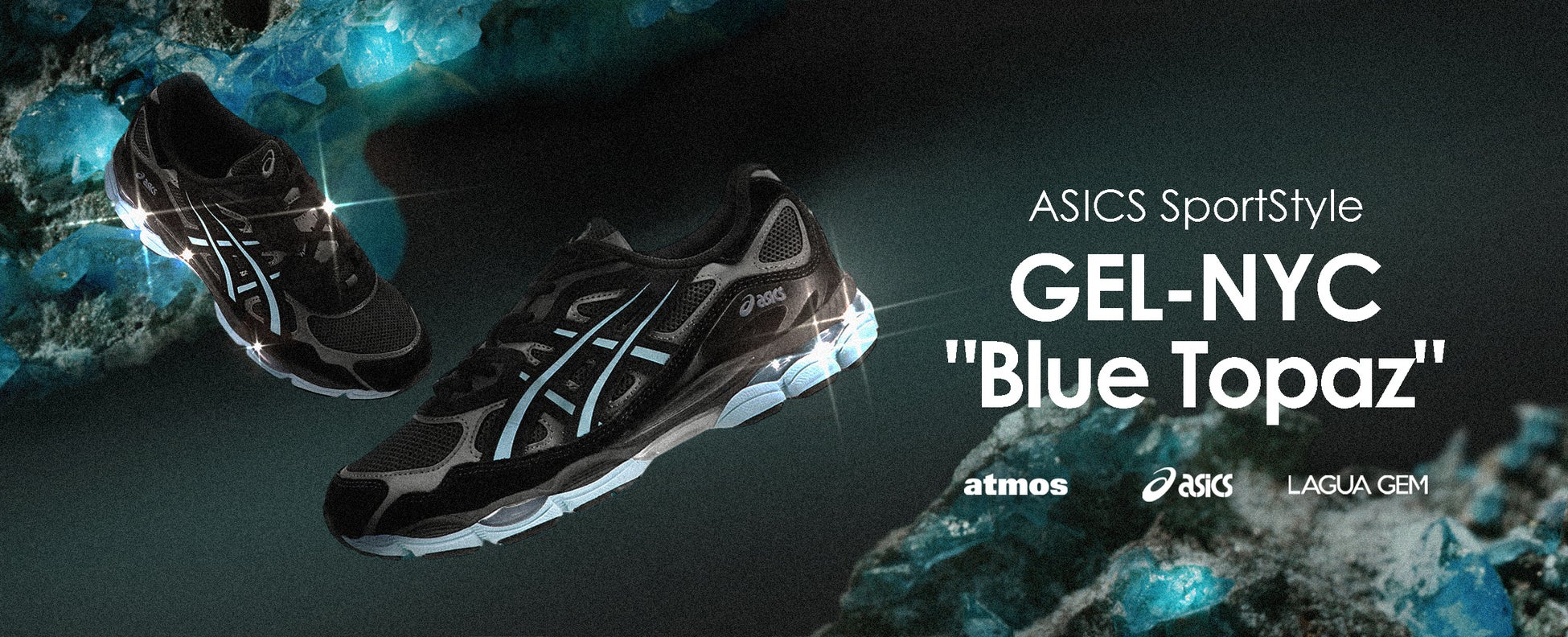 今作はレディースアパレルブランドの『LAGUA GEM(ラグア ジェム)』をサードパーティに迎え、共同デザインしたカラーリングをGEL-NYCに落とし込んだ。LAGUA GEMのブランド名の由来である『LAGUA GEM=⾚い⽯(ルビー)』に付随し、 atmosとのコラボレーションに因み 『⻘い宝⽯=ブルートパーズ』が今作のコンセプト。GEL-NYCの特徴でもあるヒール部分のGEL™︎、随所に配された光沢のあるダークシルバーパーツ、そしてリフレクター混合のシューレースが”宝⽯の輝き”を表している。アクセサリー同様に「常に⾝につけたくなるようなアイテム」として誰にでも寄り添うことの出来る⼀⾜に仕上がっています。