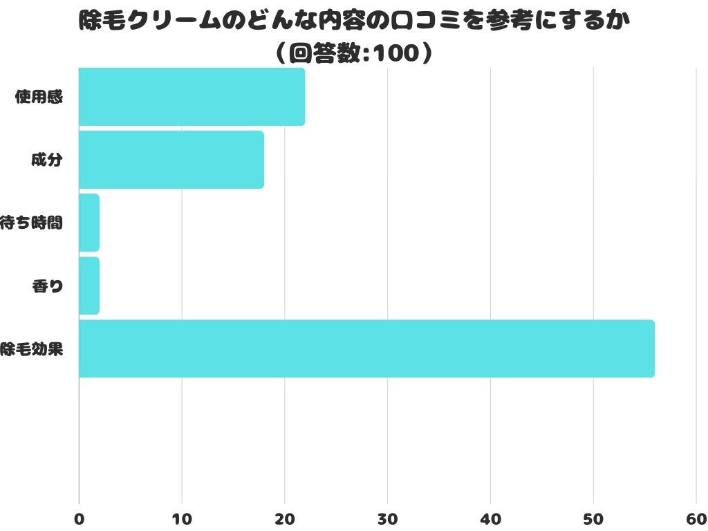 除毛クリームのどんな内容の口コミを参考にするかをアンケートにて調査したところ、1位は「除毛効果」でした。