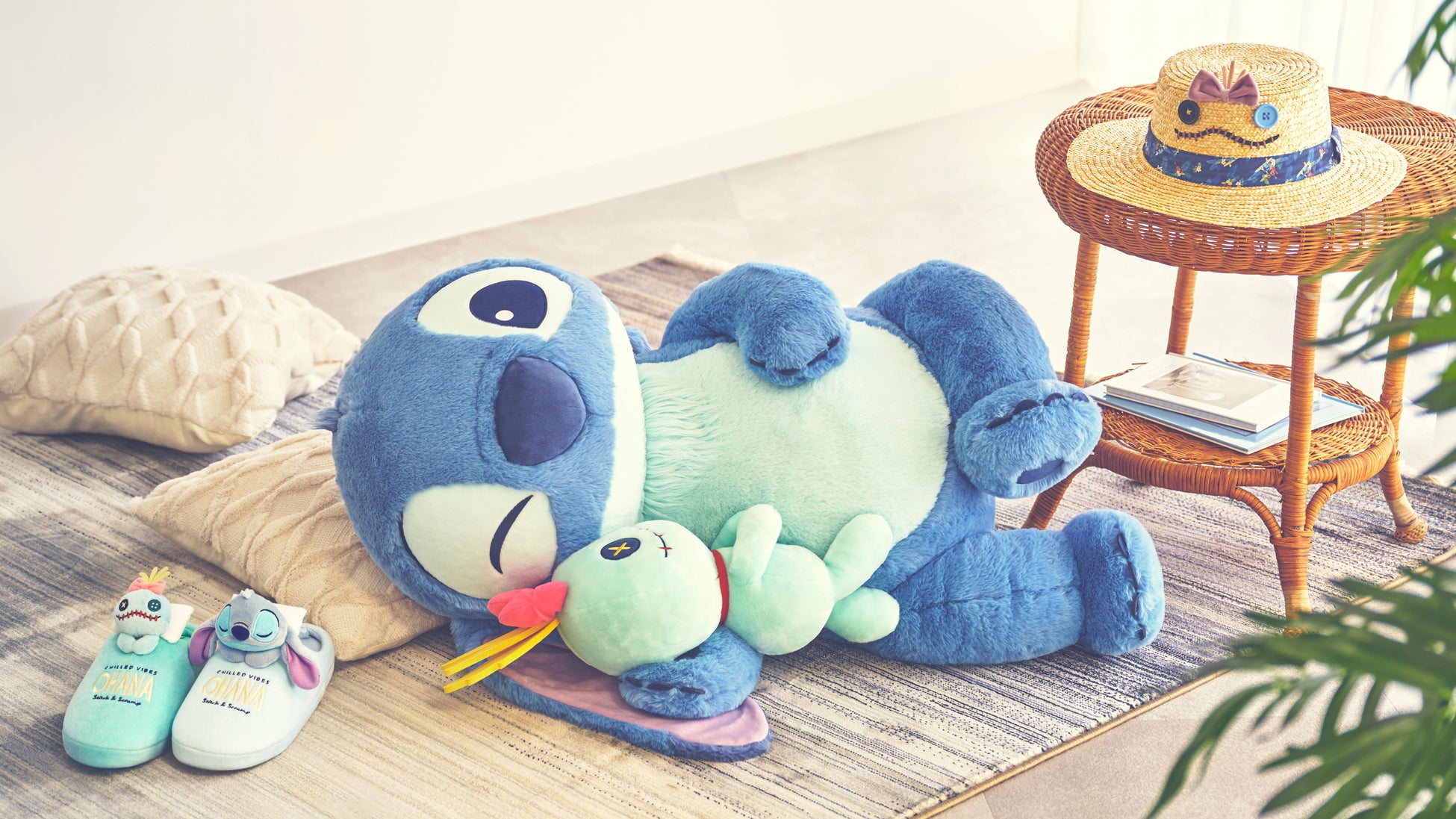 ふわふわのぬいぐるみは、スティッチが哺乳瓶を抱えるポーズが愛らしく、思わず抱きしめたくなる可愛さです。約82cmのスーパービッグサイズのぬいぐるみは、スティッチとスクランプと一緒にお昼寝気分を味わうことができ、癒やし度満点。また、総柄の半袖シャツやスクランプのフェイスをあしらった麦わら帽子、レジャーシート、晴雨兼用折りたたみ傘など、夏のおでかけにぴったりなアイテムが充実。さらに、爽やかな色味の半袖パジャマやスティッチとスクランプを片足ずつデザインしたルームシューズ、ヘアバンドなど、おうちでのリラックスタイムに嬉しいアイテムまで豊富に取り揃えます。