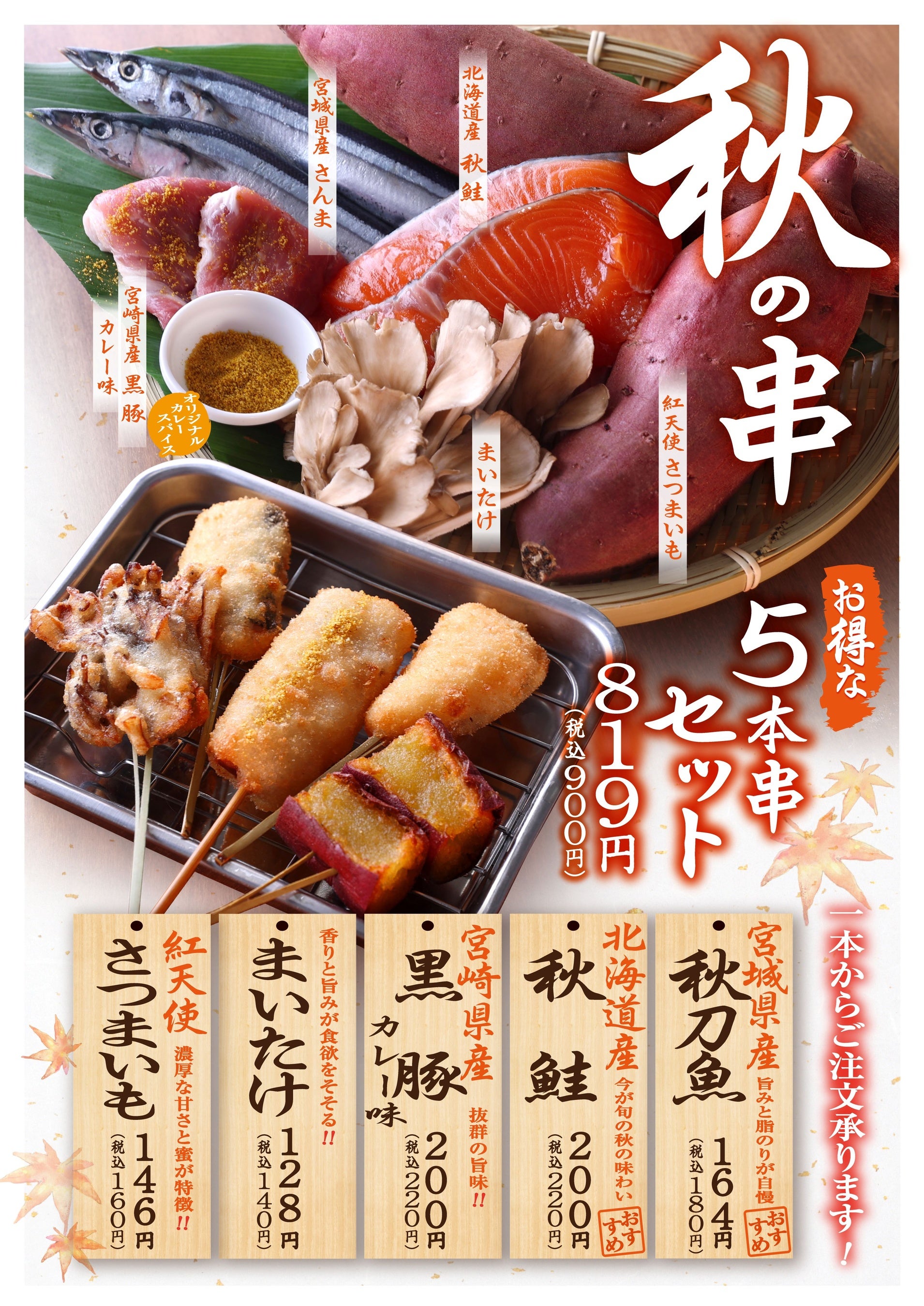 9月6日(水)からは、でんがな初となる、宮崎県産の「黒豚~カレー味~」の串かつが新登場。さらに秋の味覚の代表格「秋刀魚」、この季節に旬を迎える「秋鮭」「舞茸」「さつまいも」の計5種類の『秋の季節串』をご用意いたします。