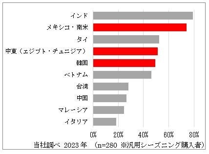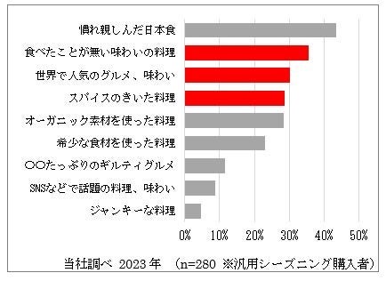 今後食べてみたい料理として、世界で人気の料理やスパイスの効いた料理への関心が高まっています。また、スパイスと聞いて連想される国として、メキシコ・南米、中東(エジプト・チュニジア)、韓国などが上位に挙がっています。