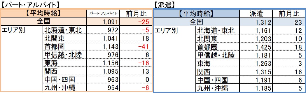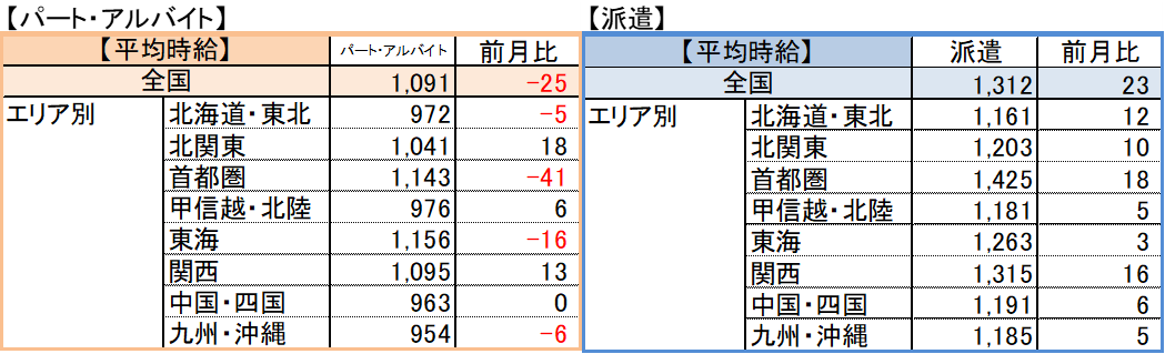 | 【パート・アルバイト】全国・全職種平均時給は1,091円。前月比-25円。前年同月比+20円。 【派遣】全国・全職種平均時給は1,312円。前月比+23円。前年同月比-4円。 【傾向】パート・アルバイトの平均時給は、減少に転じた。「家事・保育・習い事」カテゴリの高時給案件が大幅に減少したことが要因で、その動きを除けば3月以降、緩やかな増加傾向が見られる。派遣の平均時給は、6月以降、横ばいの傾向が続いている。 |