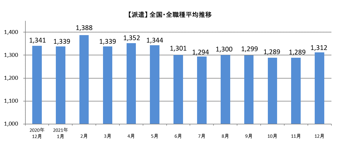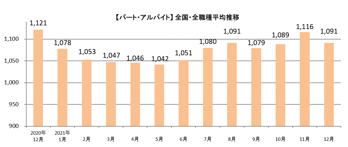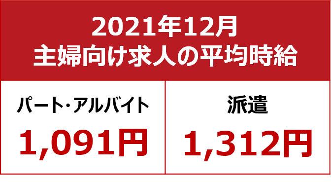 【2021年12月 主婦求人の平均時給】パート・アルバイト:『1,091円』、派遣:『1,312円』