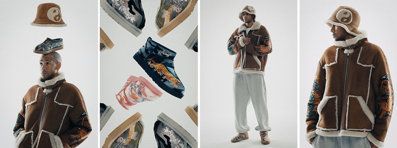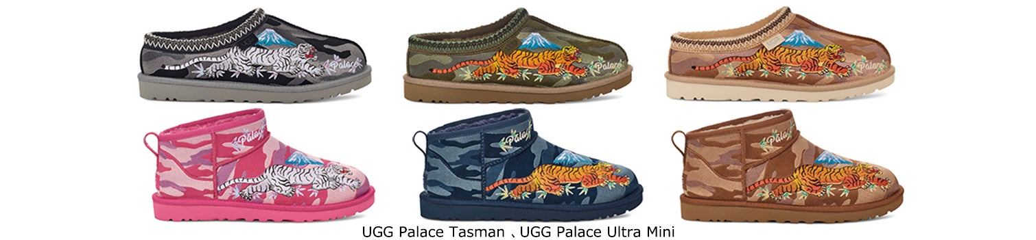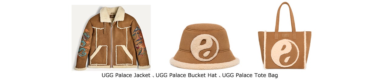 12月7日に発売されるコラボレーションは、Tasman(タスマン)ミュールやClassic Ultra Mini(クラシック ウルトラ ミニ)を含むUGGのアイコニックなアイテムに複雑なマルチレイヤーの刺繍を施し、ミックスカルチャーを表現しました。UGG Palace Tasman(アグ パレス タスマン)とUGG Palace Ultra Mini(アグ パレス ウルトラ ミニ)は、初のUGG Palace Jacket(アグ パレス ジャケット)と一緒に登場します。この新しいUGG Palace Jacketは、ソフトなスエードにシアリングのライニングが施され、袖には刺繍で表現した竜と虎、そして背中にはシアリングでデザインされたPalaceの"P"ロゴがあしらわれています。また、本コレクションを締めくくるのは、UGG Palace Bucket Hat(アグ パレス バケットハット)とUGG Palace Tote Bag(アグ パレス トートバッグ)のアクセサリーです。