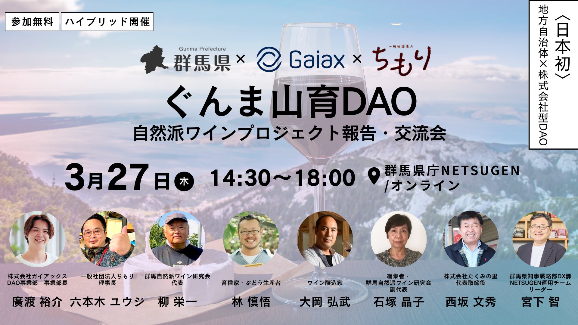 株式会社ガイアックス(東京都千代田区/代表:上田祐司)および群馬県 知事戦略部 デジタルトランスフォーメーション課 NETSUGEN室は、日本初(※)となる株式会社型DAO型を用いた地場ワイン醸造プロジェクト「ぐんま山育 DAO」の発足から1ヶ月、これまでの取り組み報告と今後の計画について、3 月 27 日(木)14 時半より群馬県庁官⺠共創スペース NETSUGEN にて、関係者のトークセッション並びに報告会を開催します。
