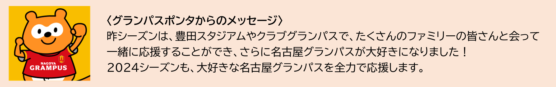 参加条件 | グランパスポンタ公式X(旧Twitter)@nge_ponta(https://twitter.com/nge_ponta/)をフォローし、「#俺たちの名古屋_グラポン」をつけて、グランパスへの応援メッセージを投稿 |
