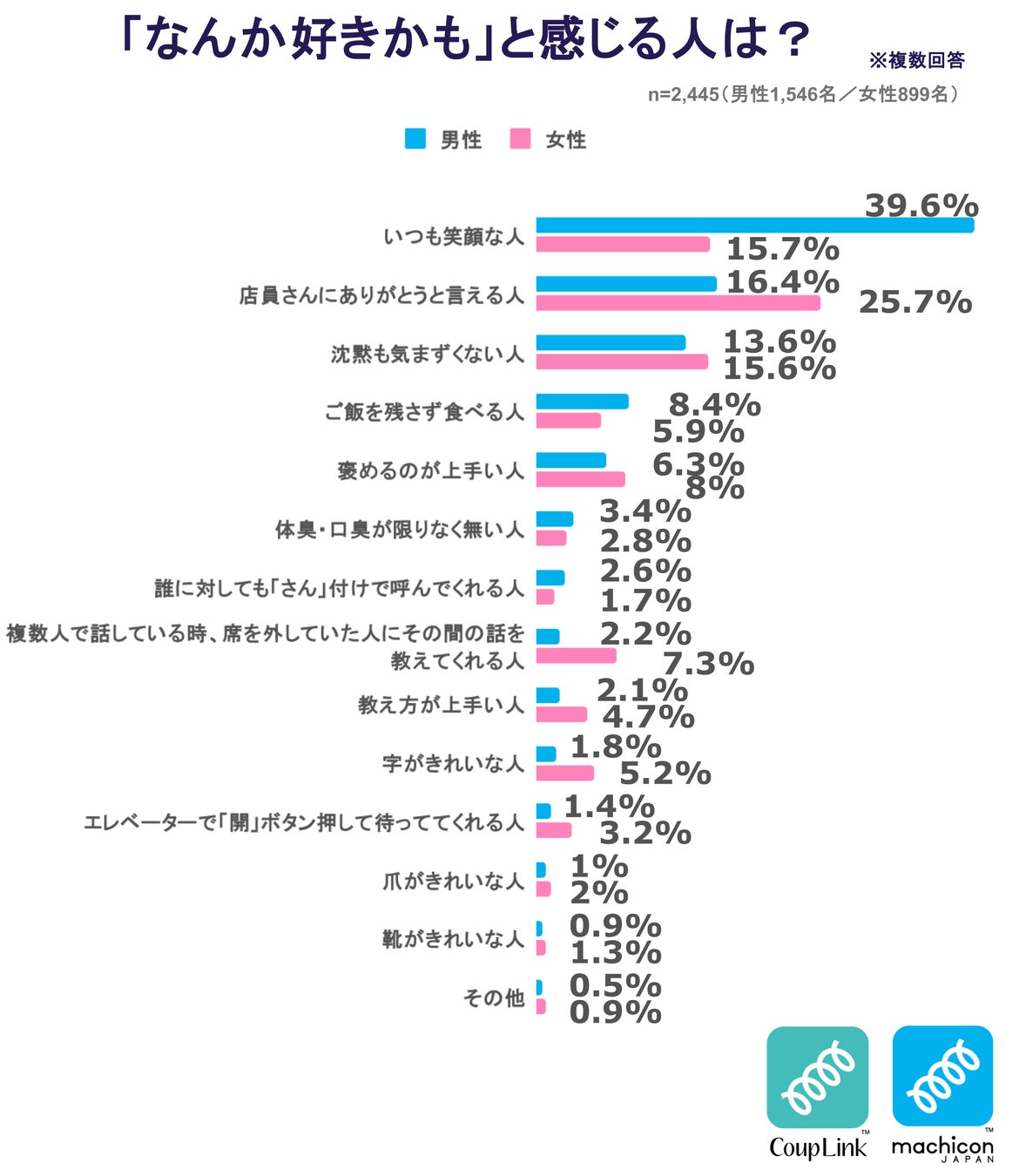 恋活・婚活中の男女2,445名に、「なんか好きかも」と感じる人はどんな人かを尋ねたところ、男性の1位は「いつも笑顔な人(39.6%)」、続いて2位が「店員さんにありがとうと言える人(16.4%)」、3位「沈黙も気まずくない人(13.6%)」という結果になりました。