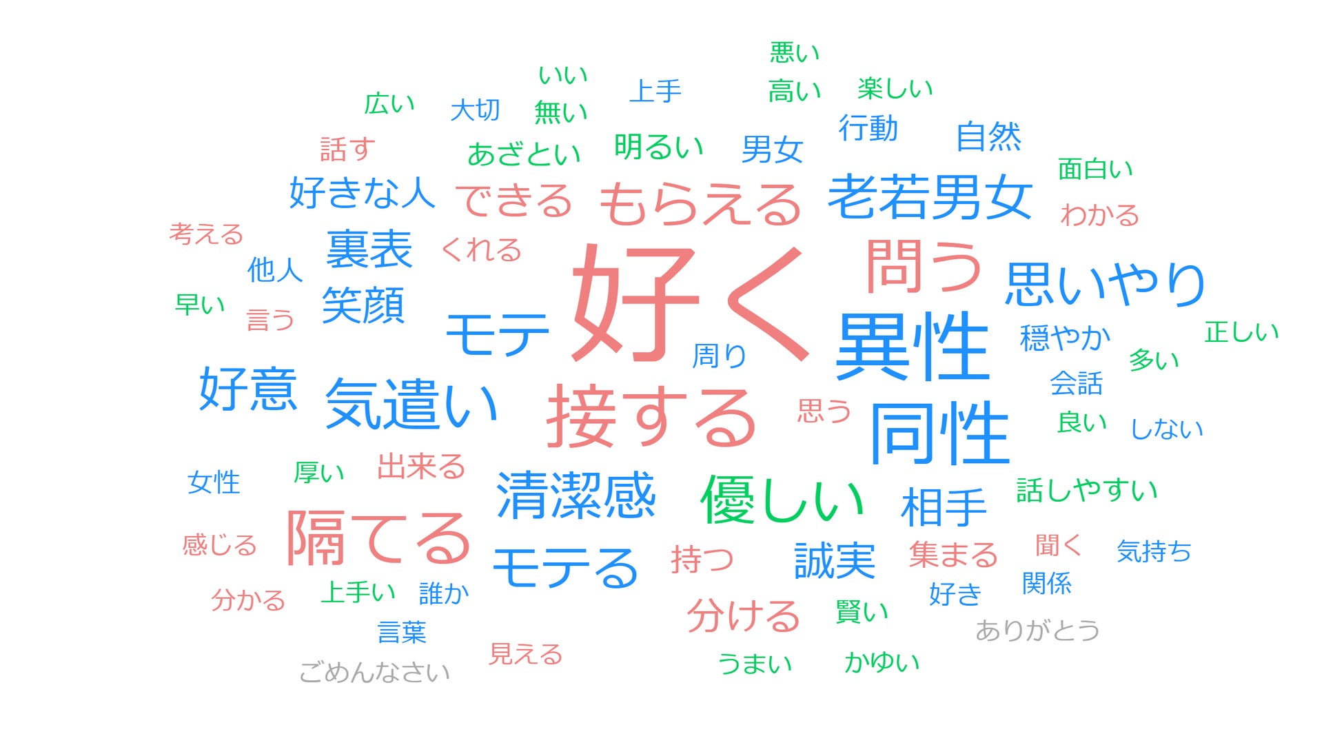 また、アンケート結果を「ユーザーローカルAIテキストマイニング」の単語スコア※1と共起キーワード※2を利用して分析した結果、大多数の方が「多くの異性から好かれる人」「老若男女問わず好かれる人」「自分の好きな人に好きになってもらえる人」と回答していました。