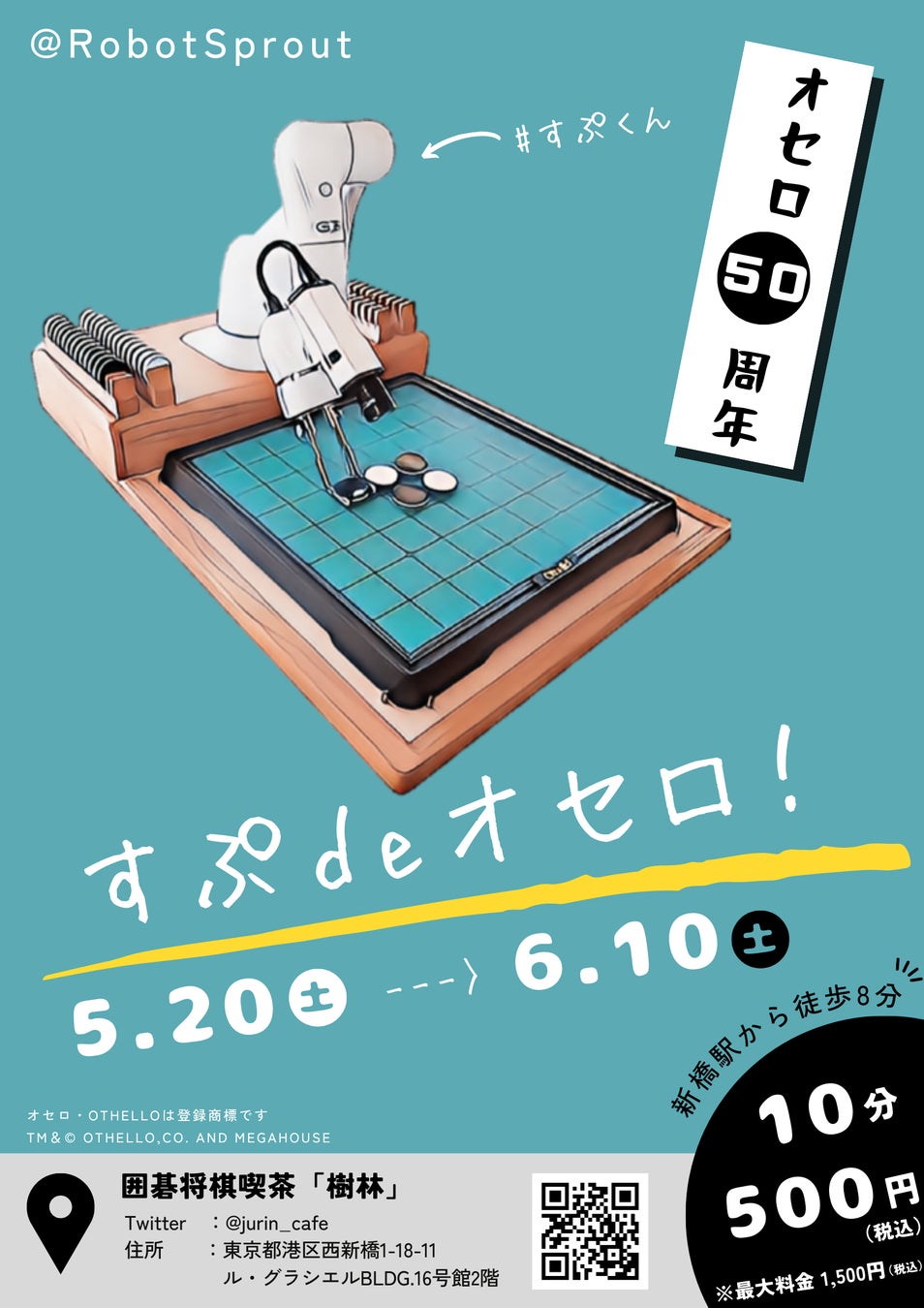 みなさんは「オセロで遊びたい!」と思っても相手がいなくて対戦が出来ない、相手と険悪になってしまいそうで気が引けてしまう経験はありませんか?そんな方に朗報です!この度はオセロ50周年を記念して、強さを調整できるオセロ ロボット「Robot Sprout(ロボットスプラウト)」すぷくんとの対戦イベント「すぷ de オセロ!」を開催いたします!今まで相手を探してきたオセロ好きの皆様、今までリアルにオセロを遊んだことがない皆様、いまが絶好のチャンスです!