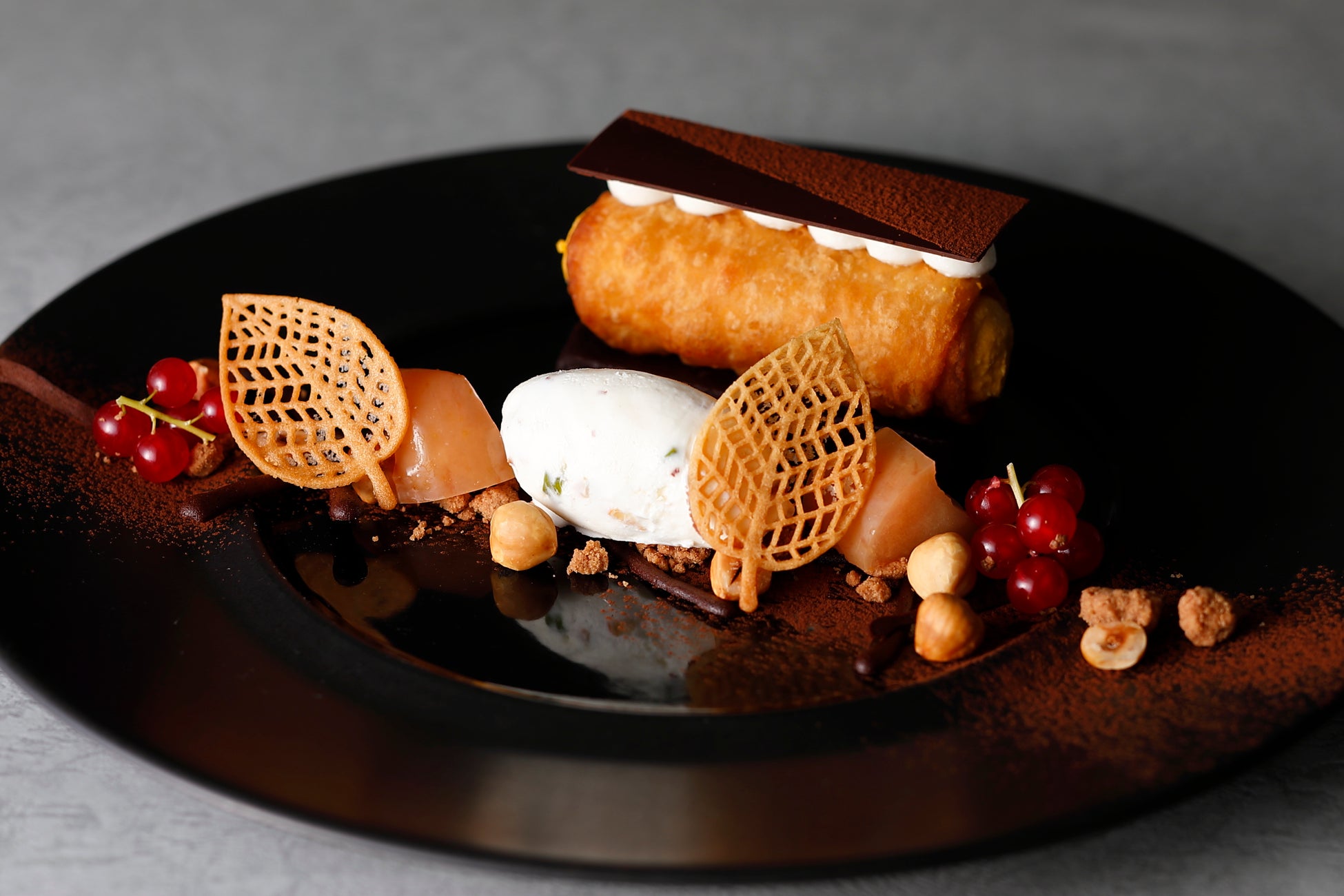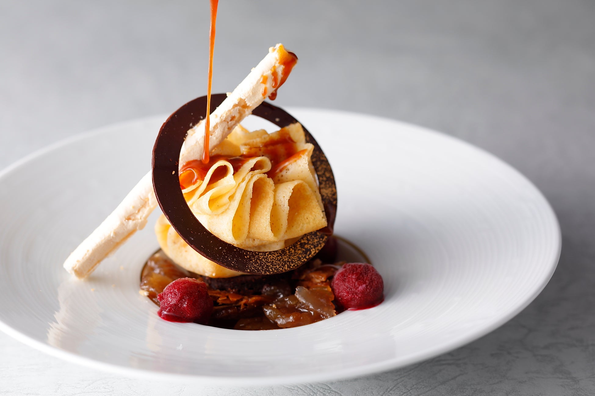 マロンムースをラム酒の香るクレープで包み、バターとキャラメルの風味が香ばしいフロランタンの食感とマロングラッセを組み合わせ、秋らしいデザートに仕立てました。添えたカシスソルベをアクセントに、別添えの温かいキャラメルソースをかけてお召し上がりください。