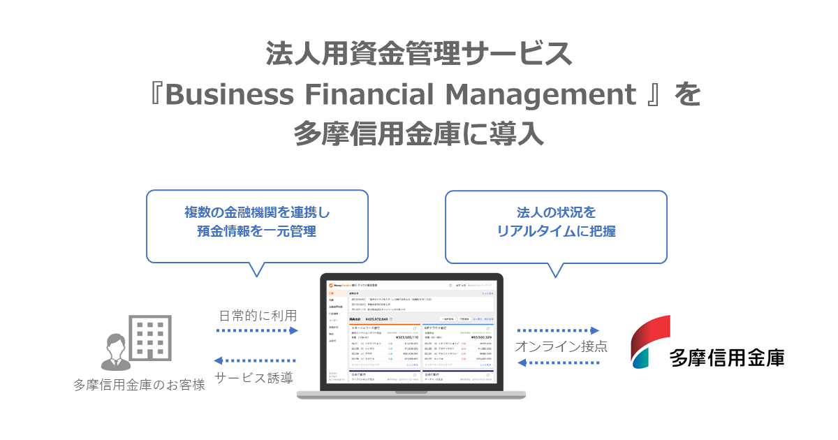 株式会社マネーフォワードは、当社が金融機関向けに提供する法人用資金管理サービス『Business Financial Management 』を多摩信用金庫に導入します。多摩信用金庫は、2021年12月23日より、『BFM』を同社の法人顧客向けに『多摩信用金庫 まとめて資金管理』の名称で提供します。