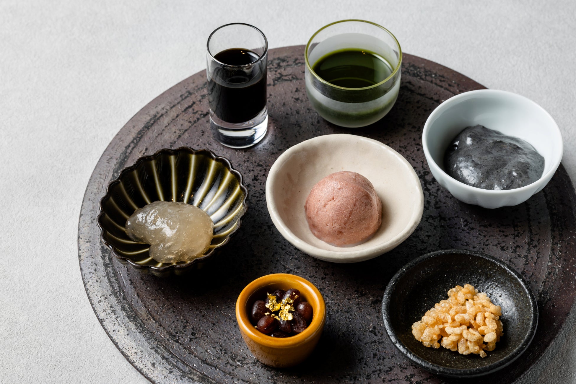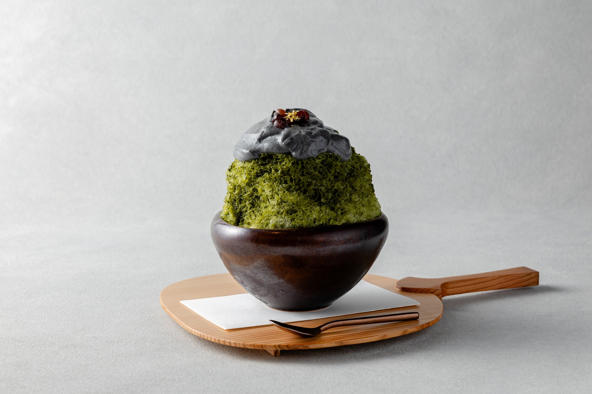 静岡県産の自然豊かな山間地域で栽培された“天空の抹茶”を使用した濃厚な抹茶ソースと、純度100%の黒ゴマと茨城県産の新鮮でコクのある「奥久慈卵」を使用した黒ゴマカスタードクリームをかけ合わせた和テイストの氷菓子。北海道産小豆と牛乳、生クリームを贅沢に使用した自家製小豆アイスと、山形県産の「はえぬき」を使用し旨味と甘みを閉じ込めた雷おこしを氷で包み、食べ進めていくほど食感と味わいの違いをお愉しみいただけます。更に沖縄島北部やんばるの黒蜜を使用した黒蜜ソースをお好みでかけていただける追いソースをご用意し、また違った味わいを感じていただけます。きらりと輝く金箔で大人のかき氷を更に演出しました。