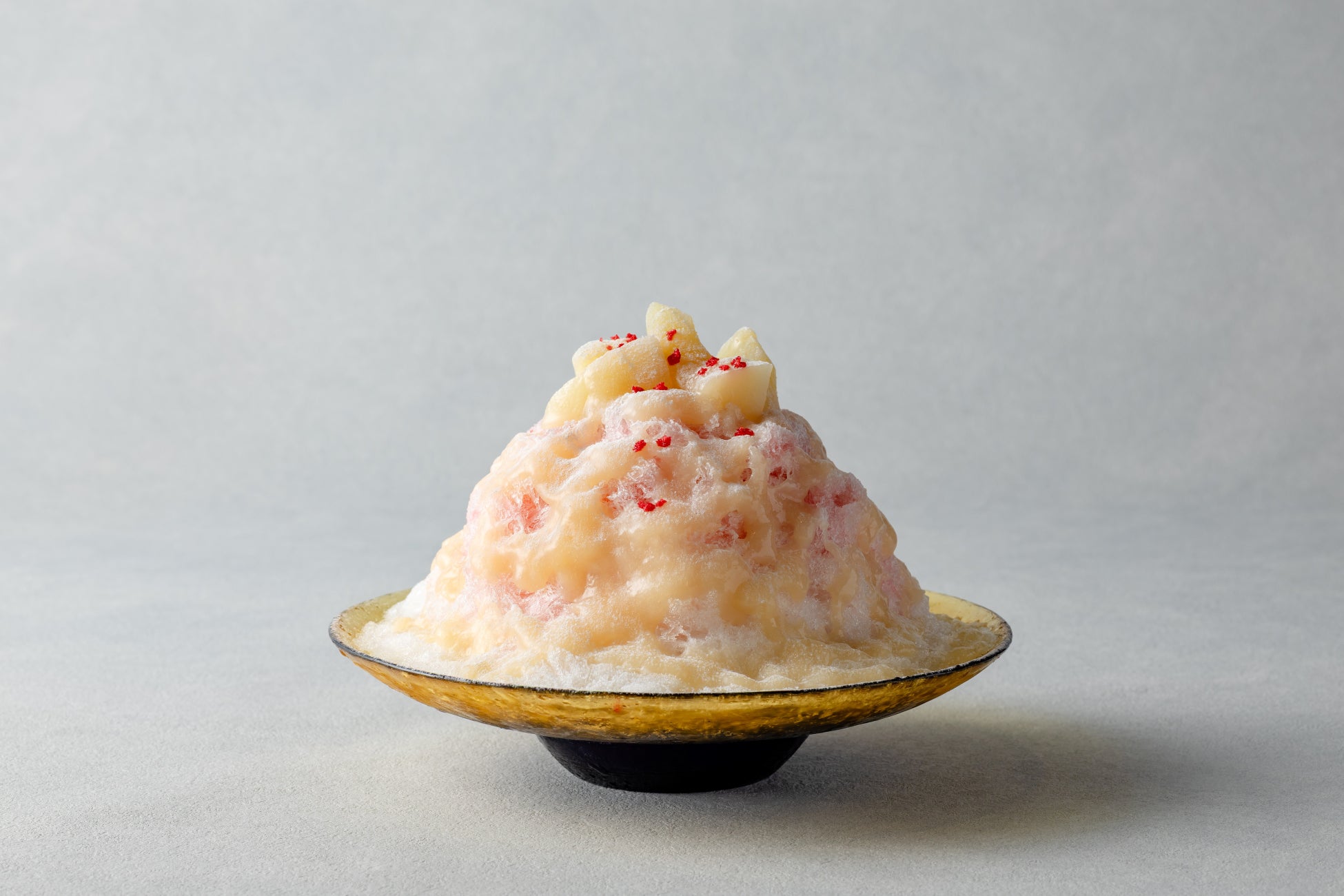 毎年ご好評いただいおります「桃」を使用し、とろける果実感と華やかな香りの余韻を感じていただける大人のかき氷に仕上げました。トップにはみずみずしい白桃のコンポートをあしらい、中心には華やかさと軽やかさを兼ね備えたバラのムースとライチのジュレ、鮮やかなロンネフェルトの紅茶を煮出したシロップでとろける果実感と華やかな香りが口の中で広がり、余韻を残します。見た目も味わいも華やかで贅沢な大人のかき氷をお愉しみください。