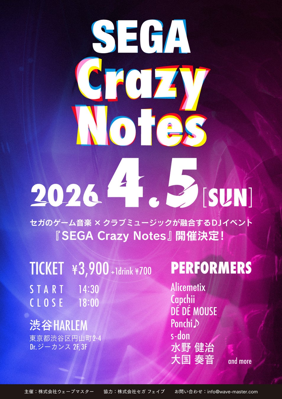 セガグループの株式会社ウェーブマスター(本社:東京都品川区、代表取締役社長:清水 信彦、以下 ウェーブマスター)は、株式会社セガ フェイブ(本社:東京都品川区、代表取締役社長執行役員:杉野行雄、以下 セガ フェイブ)協力のもと、DJイベント『SEGA Crazy Notes』を2026年4月5日(日)開催いたします。