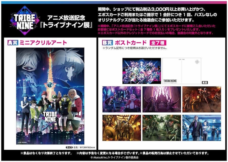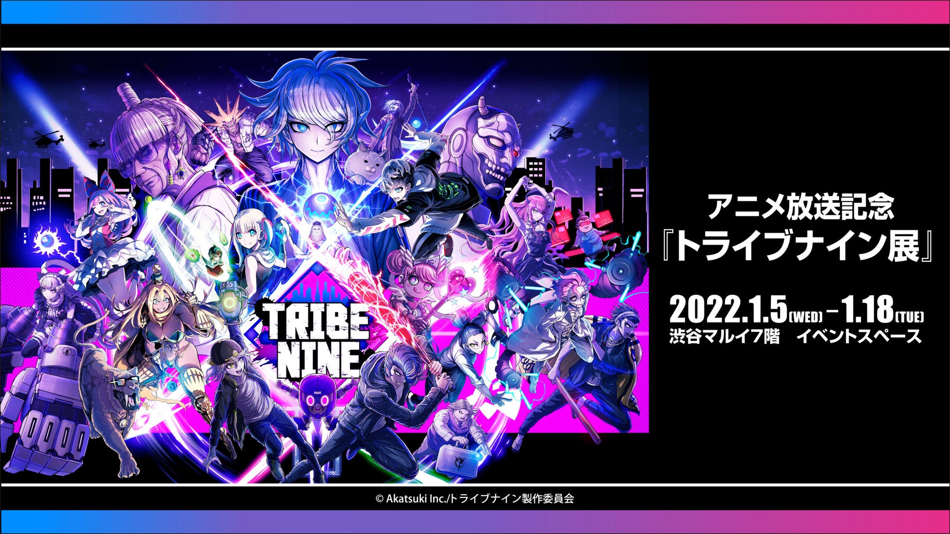 株式会社アカツキ(本社:東京都品川区、代表取締役CEO:香田哲朗、以下アカツキ)は、トゥーキョーゲームス株式会社(本社:埼玉県所沢市、代表取締役CEO:小高和剛、以下トゥーキョーゲームス)との共同新規プロジェクト『TRIBE NINE(トライブナイン)』において2022年1月5日(水)〜2022年1月18日(火)まで渋谷マルイ7階・イベントスペースにて「アニメ放送記念『トライブナイン展』」を開催することをお知らせします。イベントでは初公開となるキャラクターデザインの小松崎 類氏・しまどりる氏の初期設定画や、MVで使用された各トライブシティ景観、アニメ複製原画などの貴重なプロダクト資料展示のほか、新作グッズを販売予定です。