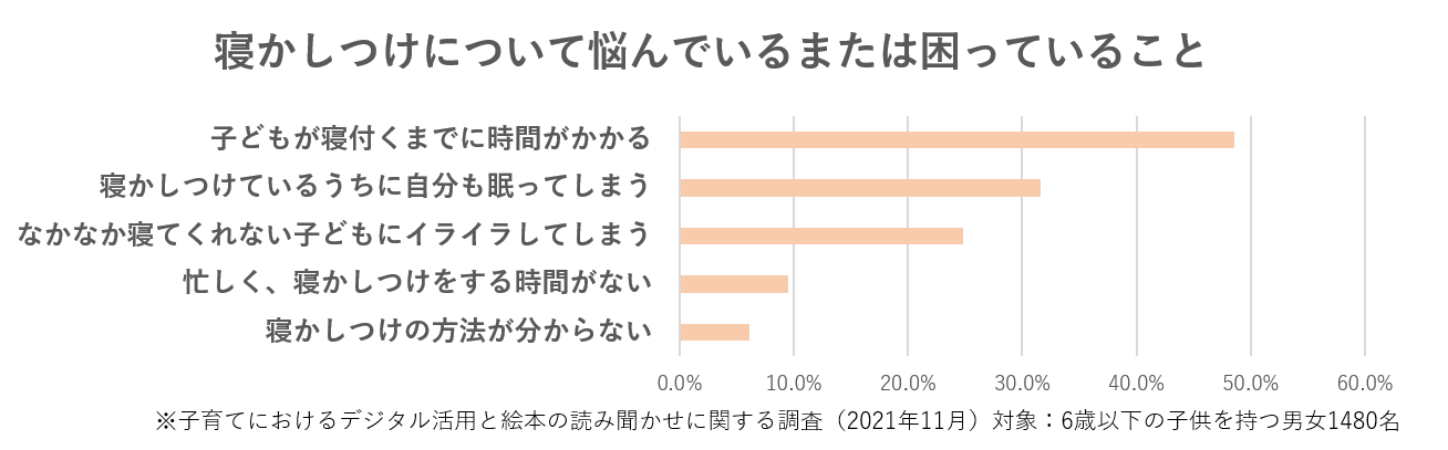 一方で、「子どもが寝付くまでに時間がかかる」「なかなか寝てくれない子どもにイライラしてしまう」といった声もあり、寝かしつけに苦労しているママやパパが多いことがわかります。