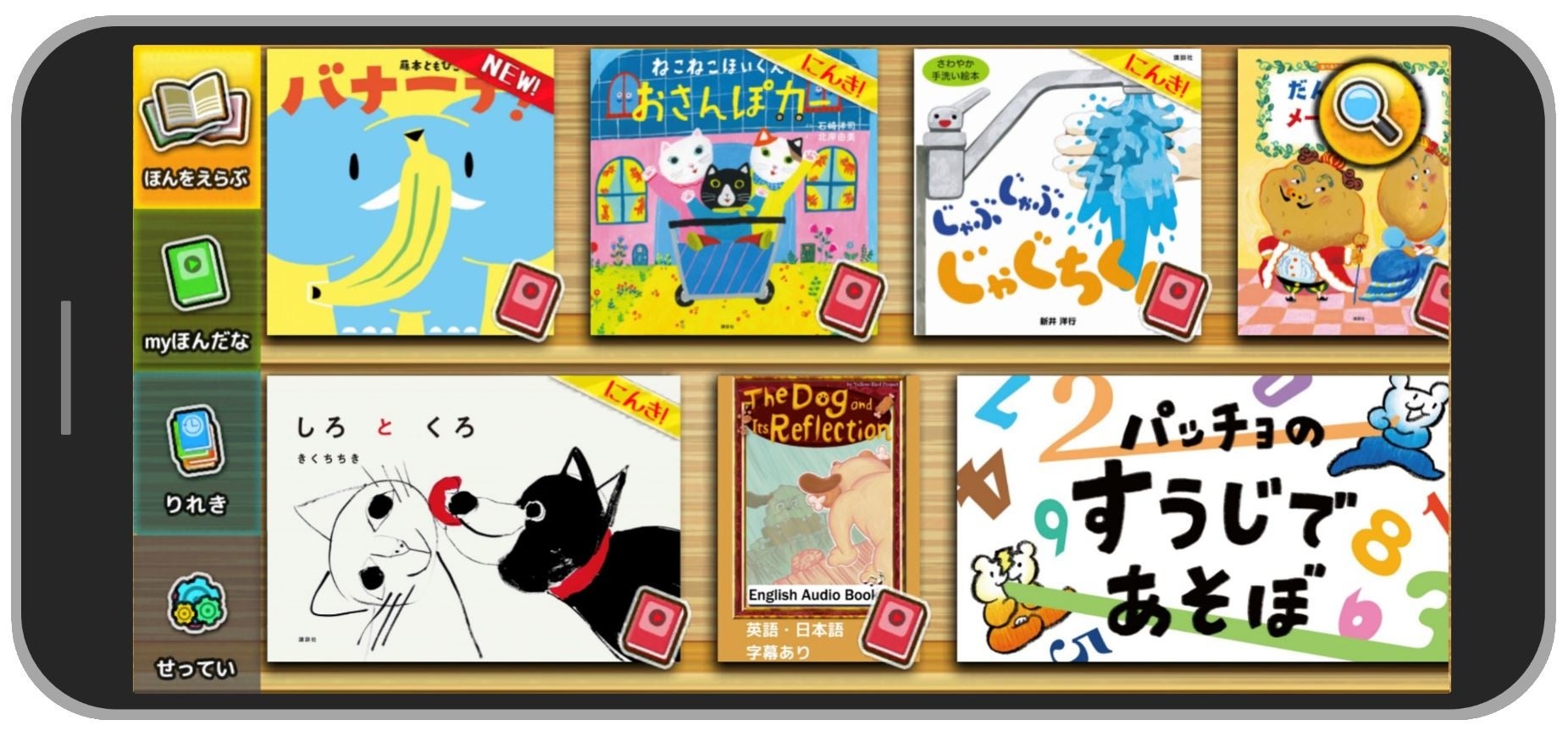 プロのナレーターによる絵本の読みきかせ音声が楽しめるほか、セリフの一部を吹き替え自分だけの本を作って遊ぶことができ、お子さまが能動的に物語の世界を楽しむことができます。