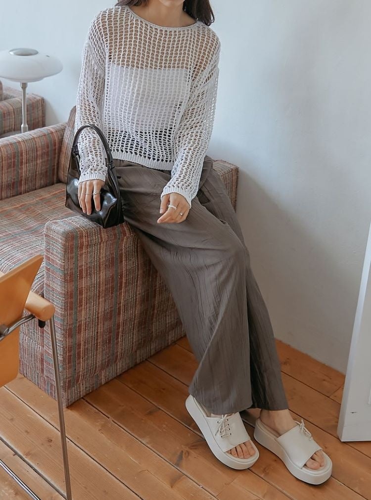 ふっくらとしたデザインとサイドのリボンがラブリーなサンダル。メッシュのオーバーニット&とろみ素材のパンツでリラクシーなコーデに。