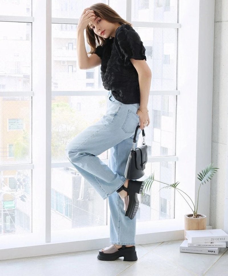 太めのアッパーと厚底で華奢見えするプラットフォームサンダル。黒でまとめたキュートなトップス&小物はデニムとも好相性。