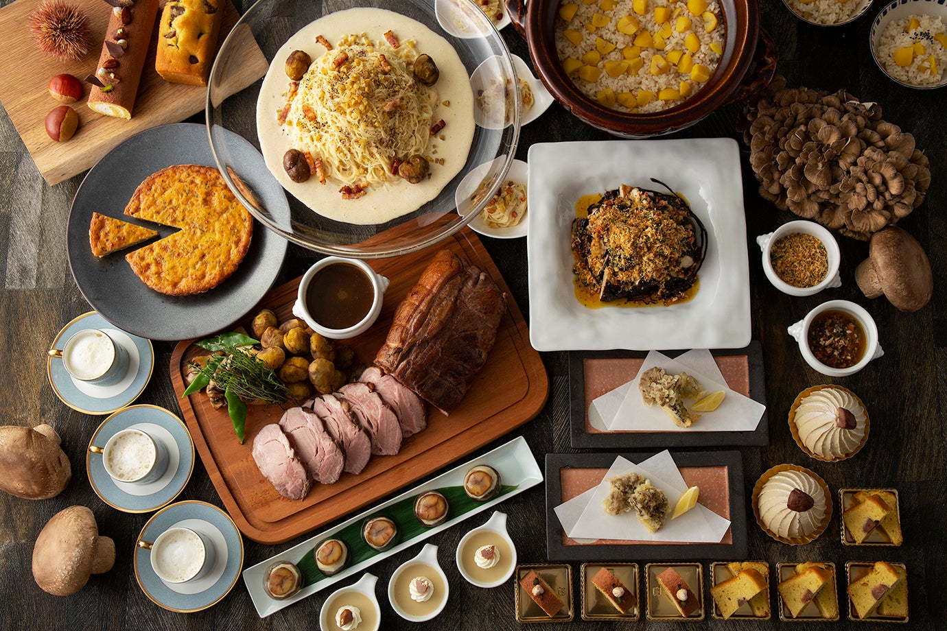 ローストポークの揚げ栗添え/栗のスープ カプチーノ仕立て/栗の冷製カルボナーラ/栗のキッシュ/ジャンボ椎茸の香草パン粉焼/土鍋栗ご飯/水まんじゅう/舞茸天麩羅/栗のプリン/栗のパウンドケーキ/