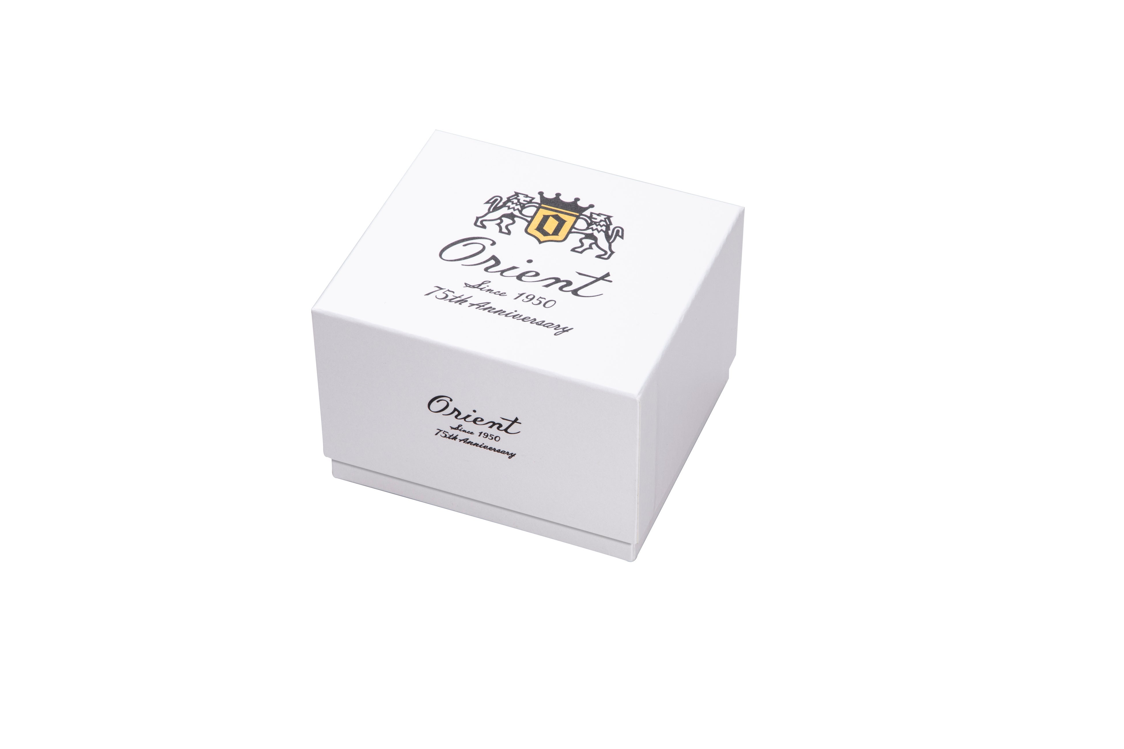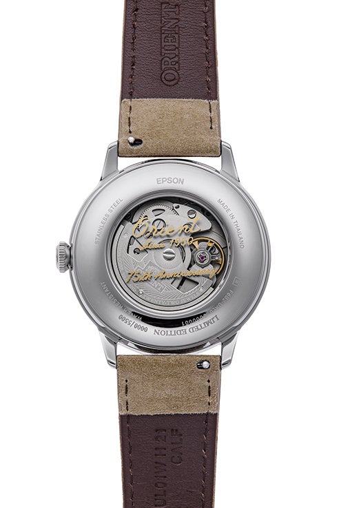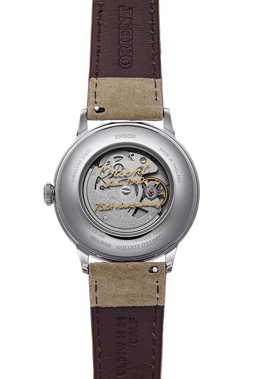 カジュアルなイメージを打ち出す最新作とは対照的なのは、オリエント75周年を記念する数量限定モデルの『オリエントバンビーノ』(国内1,200本・海外8,300本)と『オリエントバンビーノ サンアンドムーン』(国内750本・海外4,750本)です。自社製の機械式時計を世界中で販売し続け2025年に75周年を迎えたオリエントを祝す2つのモデルは、1950年代に使用していた筆記体の旧オリエントロゴをはじめ、ピンクゴールド色の略字と青色の針を配したホワイト文字板や、レトロ感のあるベージュのヌバック皮革を使ったバンドなどがもたらす格別なビンテージルックが特長です。さらに、機械式ムーブメントを見せるシースルーの裏蓋には、筆記体による「Orient Since 1950 75th Anniversary」の文字と数量限定シリアル番号の刻印が記され、付け替え用のカーフバンドが付属するなど、記念モデルならではの特別感にあふれています。