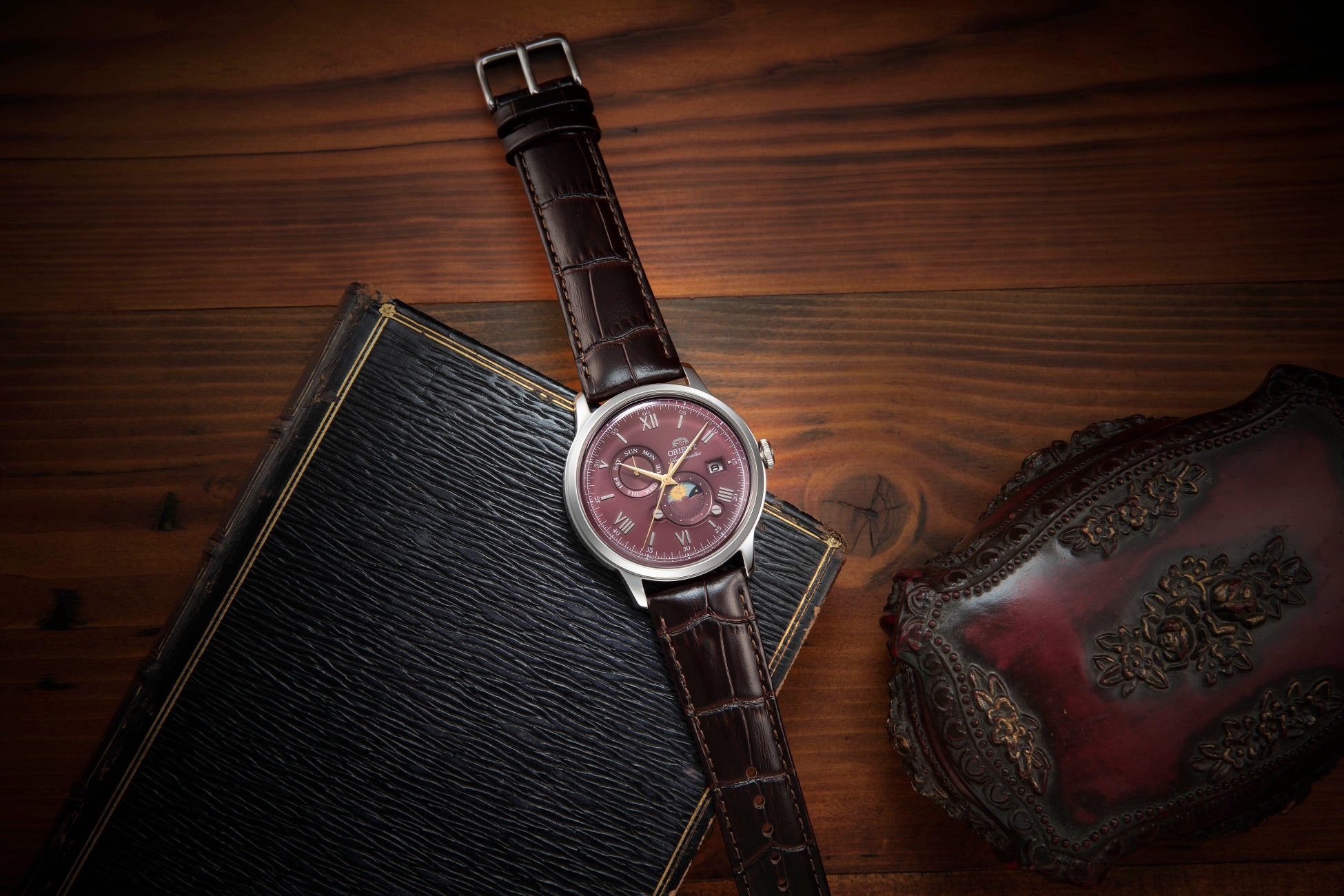 もうひとつは『オリエントバンビーノ サンアンドムーン』です。太陽と月のモチーフを配したディスクが24時間で1回転する「サンアンドムーン」の機構が移ろう時の情景を視覚化しています。さらに、その「サンアンドムーン」と指針式の曜日表示のアシンメトリーな配置が、放射目のボルドー文字板と相まって独特のフェイスを引立てています。