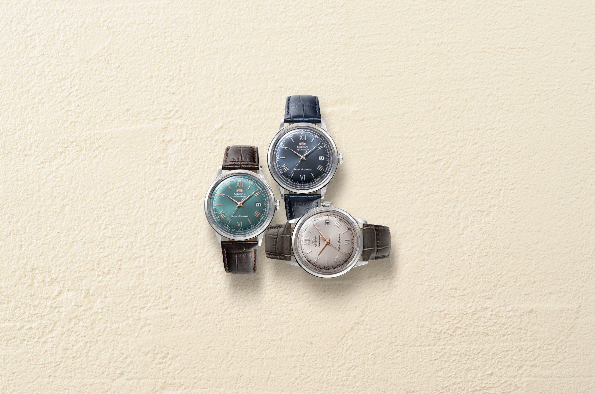 新しいカラーリングによる文字板は、放射目のグリーン、ネイビー、そして「オリエントバンビーノ」では初となるベージュの3色をラインアップ。文字板の美観を強調するのは、ニュアンス豊かな各色との色彩効果を計算してピンクゴールドやシルバー色を巧みに使い分けたローマ数字や針です。これによって、クラシカルな『オリエントバンビーノ』が普段使いしやすいファッショナブルな時計へと生まれ変わりました。
