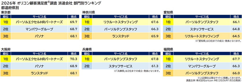 「神奈川県」「福岡県」の2県で【リクルートスタッフィング】が3年連続1位