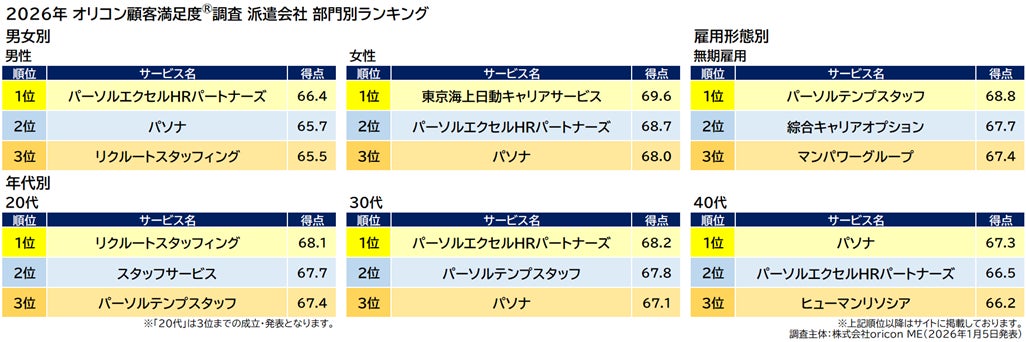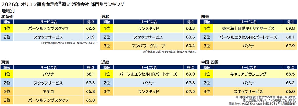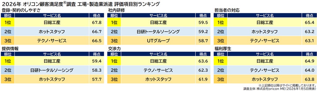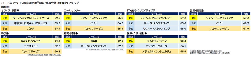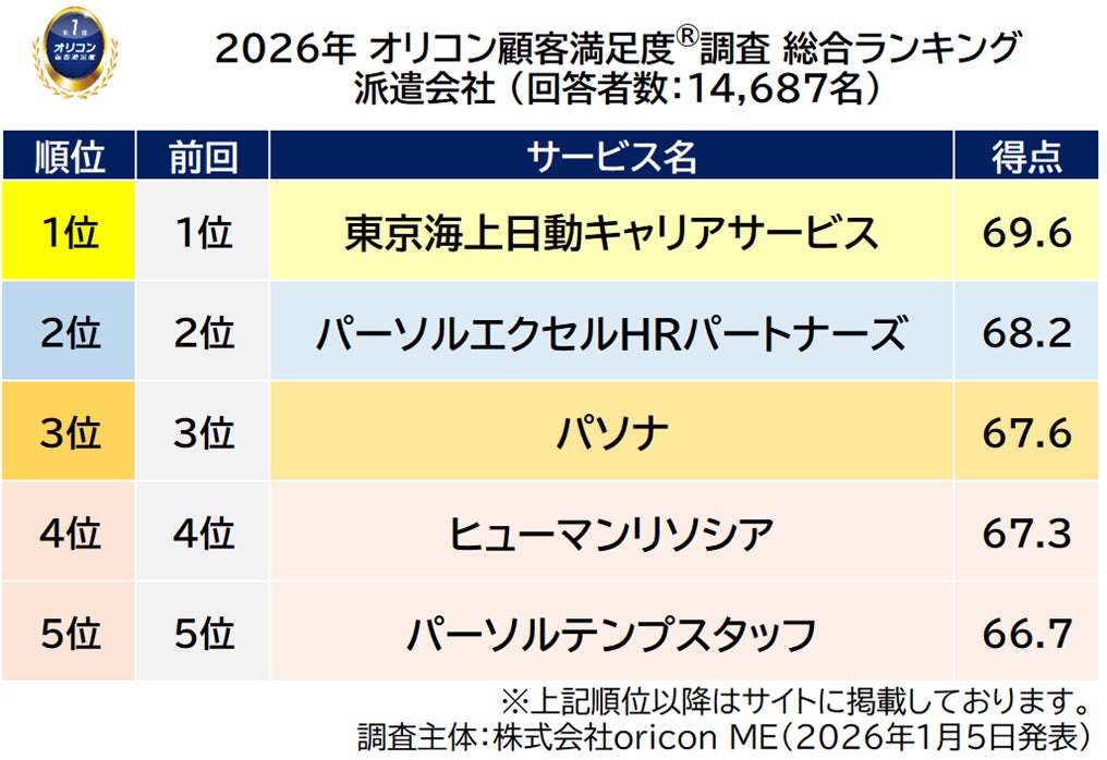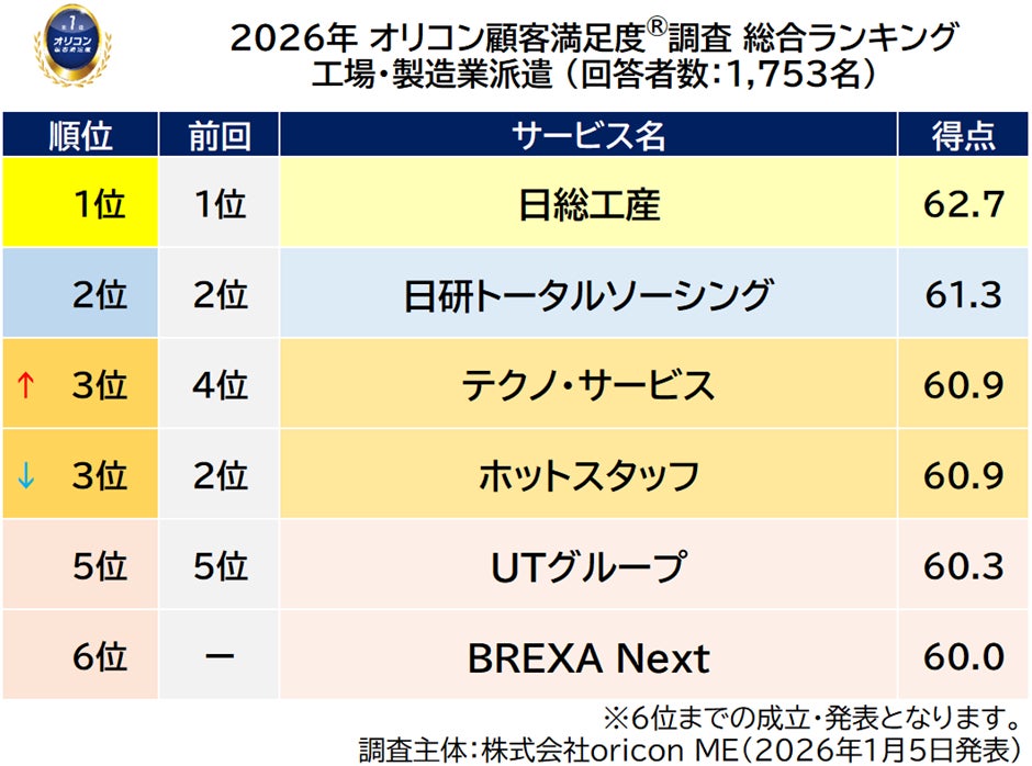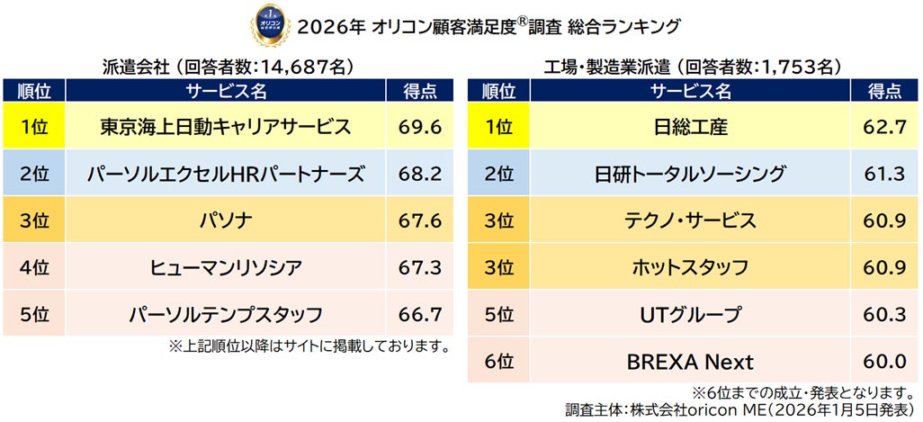 オリコン株式会社(本社:東京都港区 代表取締役社長:小池 恒、略称:オリコン)は、グループ会社である株式会社oricon MEが、実際のサービス利用者を対象に第三者の立場で実施した『派遣会社』『工場・製造業派遣』についての顧客満足度調査の結果を、2026年1月5日(月)14時に「オリコン顧客満足度®」公式サイト内にて発表いたしました。ランキングは以下の通りとなりました。